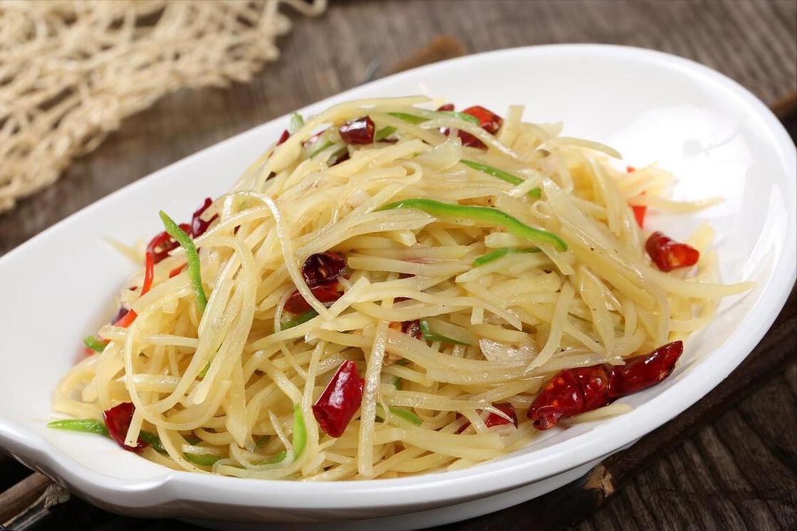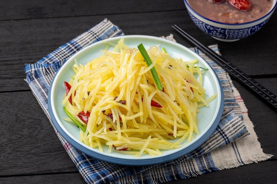 土豆洗淨後削皮,然後切成細絲,切好後的土豆絲,用清水淘洗2遍,再把青辣椒切絲、幹辣椒切段、大蒜切末。鍋中倒油,爆香大蒜和幹辣椒,緊接着倒入土豆絲,大火爆炒片刻後,往裏面來點鹽、味精、白醋、生抽調味,炒熟後放上青辣椒,簡單翻炒兩下,出鍋。