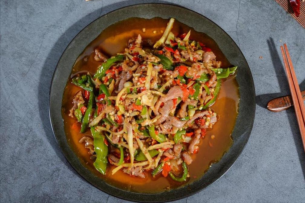 2、接着放入二荊條辣椒、小米椒、仔姜翻炒片刻,炒香以後再來點生抽、蠔油、老抽、料酒調味,接着添上清水燉。大火煮開,小火燉40分鐘以上,最後加入鹽和味精調味,大火收汁後,就可以盛出來開喫了。