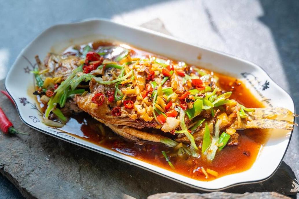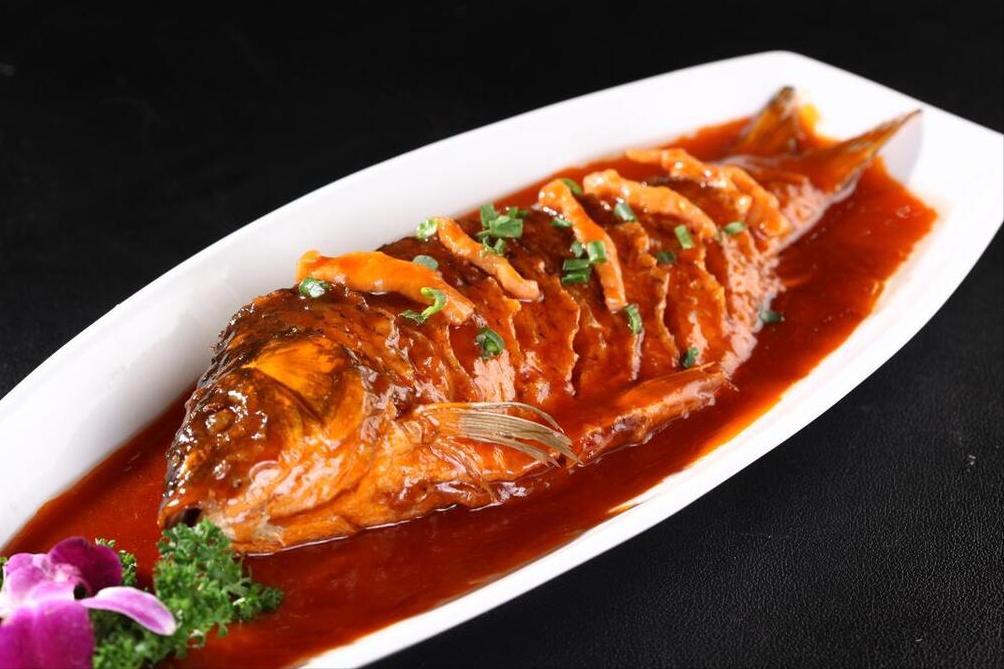 2、下面往鍋內倒油燒熱,下入魚兩面煎一下,煎到金黃出鍋。隨後倒入蔥薑蒜爆香,然後來1大勺番茄醬、1大勺白糖、少許鹽、雞精、蠔油、醋調味,接着來上少許水,炒勻後倒入煎好的魚,煮到湯汁濃郁,撒上蔥花出鍋。