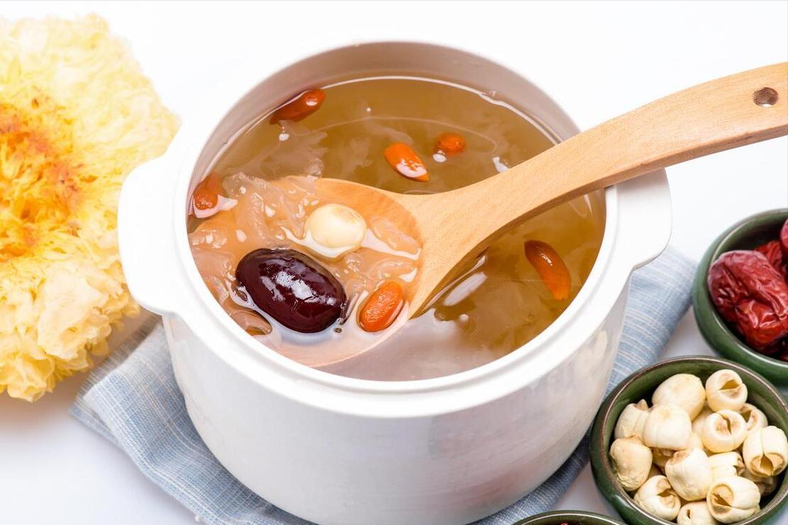 銀耳泡好後,撕碎倒在鍋子裏,蓮子、紅棗清洗乾淨之後,也一起加進去,接着添上適量的清水,蓋上蓋子保持大火煮。煮開後轉爲小火,接着煮30分鐘以上,隨後敞開蓋子,將枸杞下進去,冰糖放上幾塊,就可以出鍋啦。