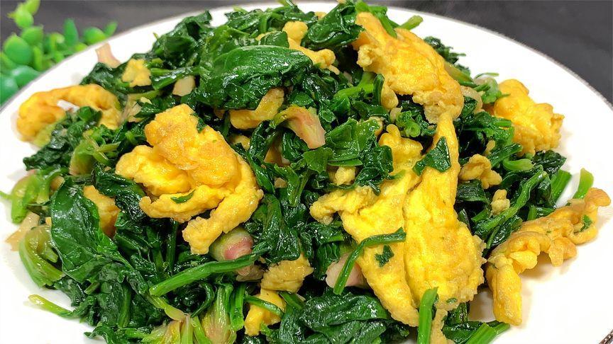 2、鍋中倒入適量食用油,燒熱後倒入雞蛋液,炒熟盛出。鍋中再倒入適量食用油,燒熱後放入蔥末爆香。放入菠菜翻炒至變軟。加入炒好的雞蛋,翻炒均勻即可。