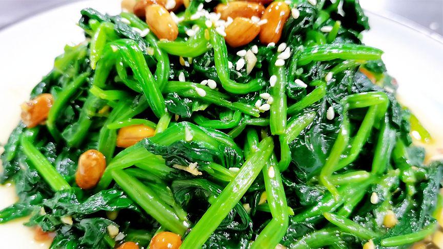 2、菠菜切段,焯水後過涼水,用力攥幹水分。將菠菜和花生米放入碗中,加入蒜末、薑末、糖、鹽、味精、陳醋,攪拌均勻即可。