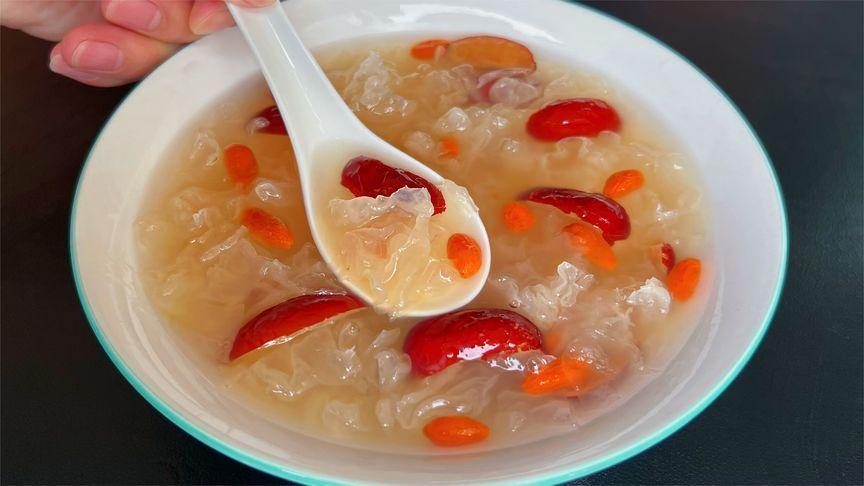 2、燉至銀耳出膠變得濃稠時,加入紅棗繼續燉煮。大約半小時後,加入枸杞和冰糖,再煮幾分鐘至冰糖融化即可。