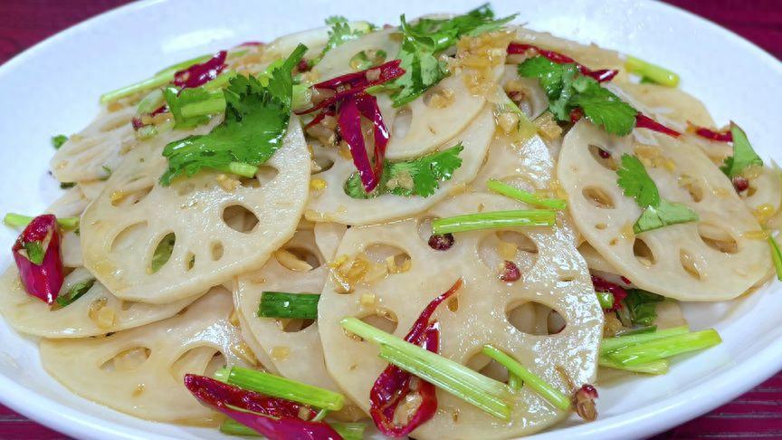 3、鍋中燒油,油熱後加入紅油,起鍋翻勻,倒入花椒和幹辣椒,翻炒出香辣味,注意油溫不要太高,以免辣椒炒糊。把調好的香料倒入蓮藕中,顛盆拌勻,化開調料,給蓮藕充分入味後即可裝盤。