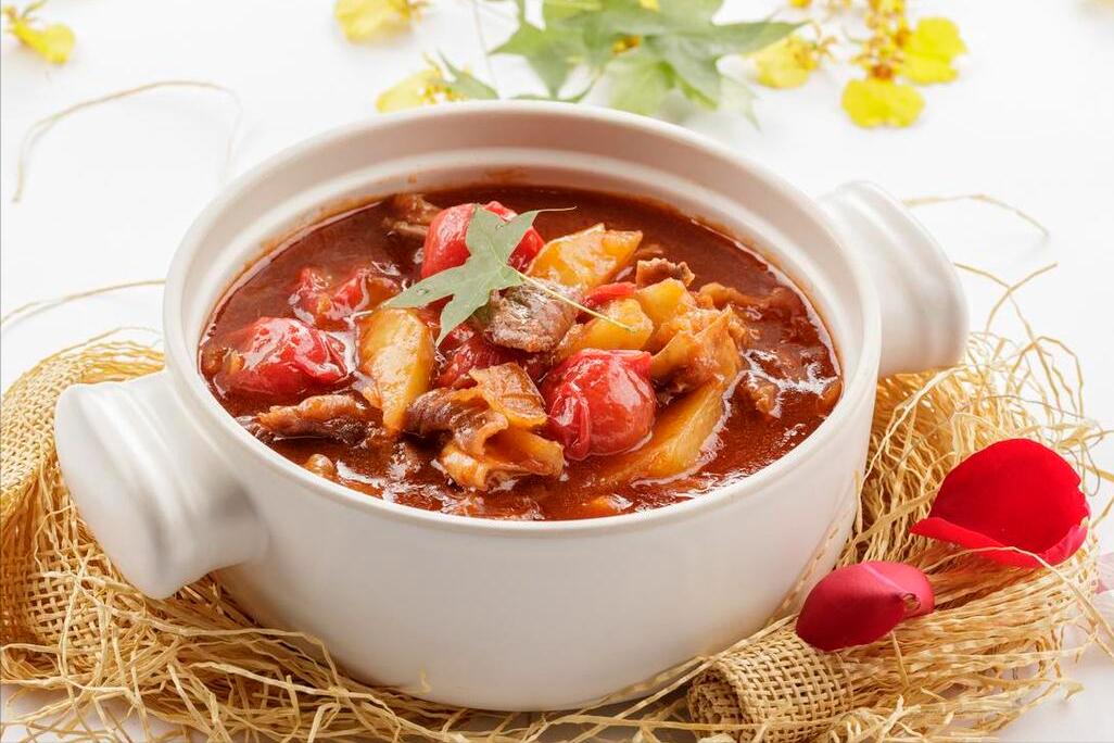 6、加進去以後,把蓋子蓋上,開大火燒開後,再用小火繼續燉40分鐘以上,隨後把土豆和西紅柿也一起加進去,這個時候來點鹽、雞精調味,蓋上蓋子再燉20分鐘,把湯汁簡單收一下,就可以享用啦!