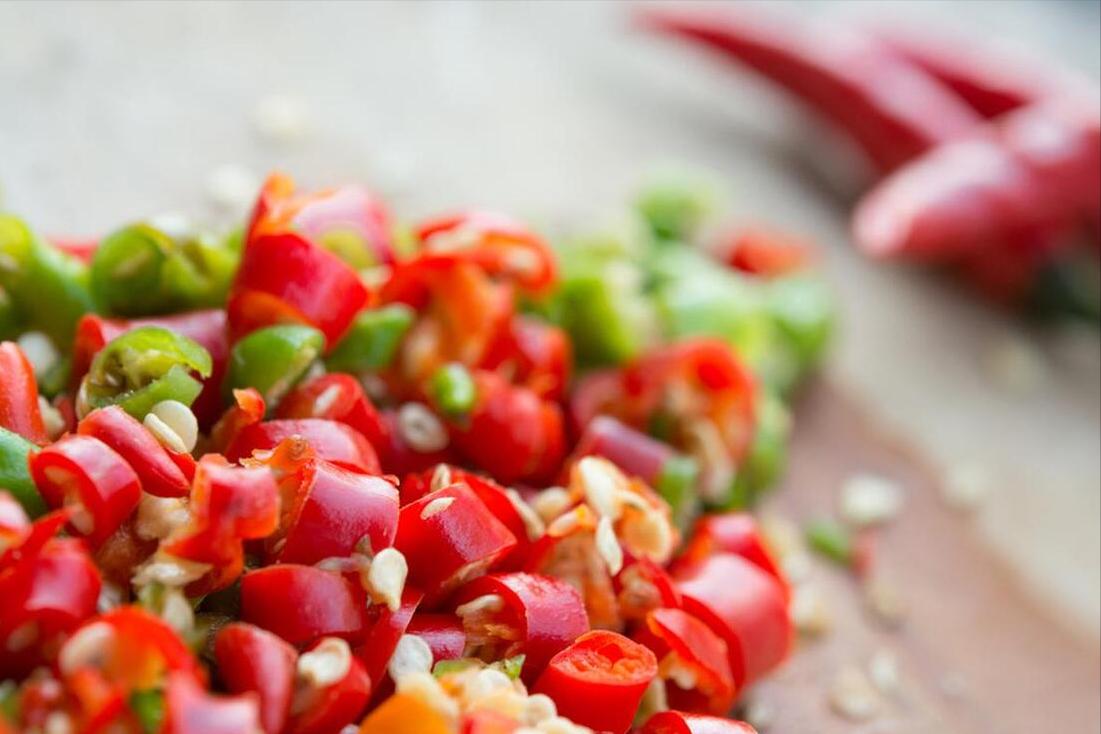 3、在表面水分沒有完全晾乾的時候,是不可以摘掉蒂部的,否則生水進入,很容易出現變質的情況。接下來,我們將辣椒放在案板上,用刀切碎,或者直接放入料理機,將其打碎,這樣更節省時間。