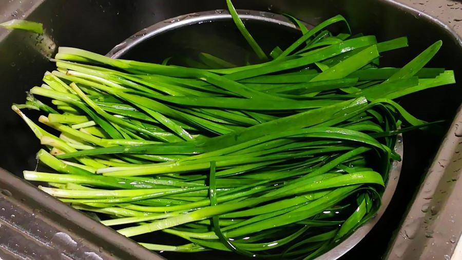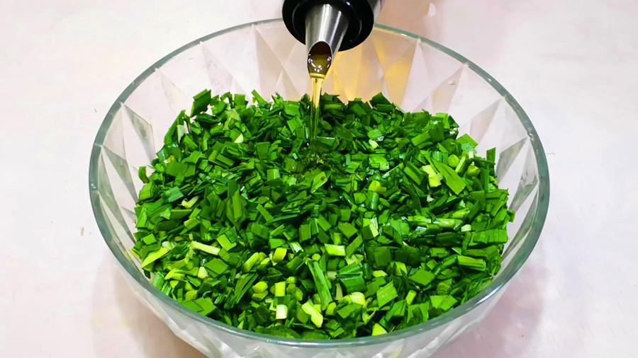 2.摘洗韭菜,韭菜要想不出水,摘洗乾淨後一定要控乾淨水分。切的時候先把帶土的根部切掉不要,切細的韭菜放入盆中,加入適量的食用油攪拌均勻後,再放一邊備用。這一步可以在韭菜的表面形成一層保護膜,從而能夠鎖住韭菜的鮮味和水分,防止韭菜出水。