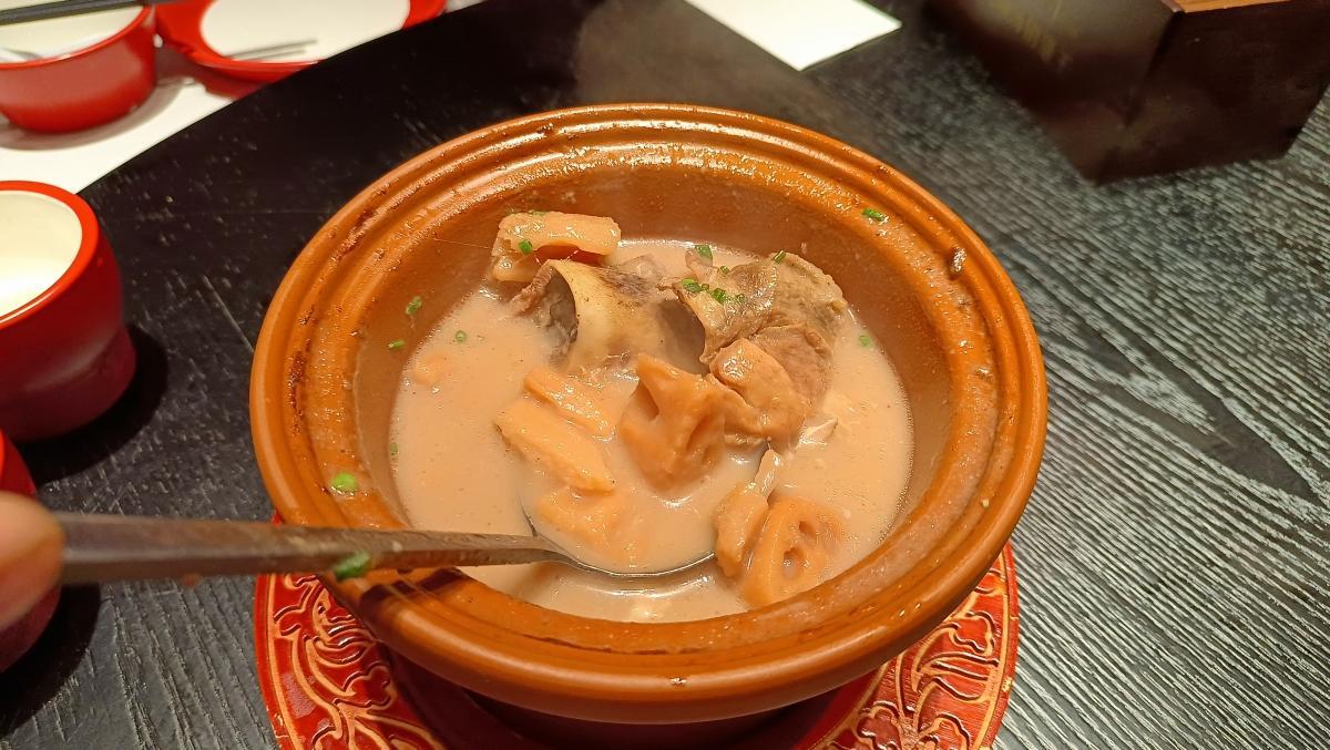 這是一道湖北特色菜,湯汁濃稠奶白,肉軟爛脫骨、蓮藕香糯可口。據說,在湖北素有“無湯不成席”的說法,筒骨煨藕湯是湖北人家在小酒席都不可缺的一道傳統菜。所用的食材爲洪湖的粉藕之五和上等新鮮的筒子骨,經過多道工藝精心煨制而成,喫起來藕斷拉絲、藕片粉糯細膩,湯味鮮甜醇香濃郁,讓人回味無窮!姐姐說這是她喫過的最好的藕湯,還說回來一定要做給我們喫呢。