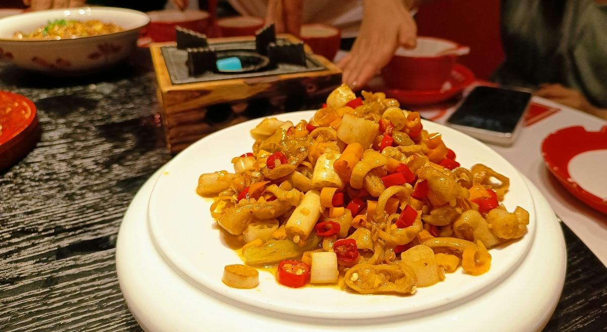 據說是這是湖北人下飯店必點的一道時令菜,藕帶脆嫩爽口、酸酸甜甜的,肥腸彈彈的很有嚼勁,它們倆搭配在一起喫着格外美味!
