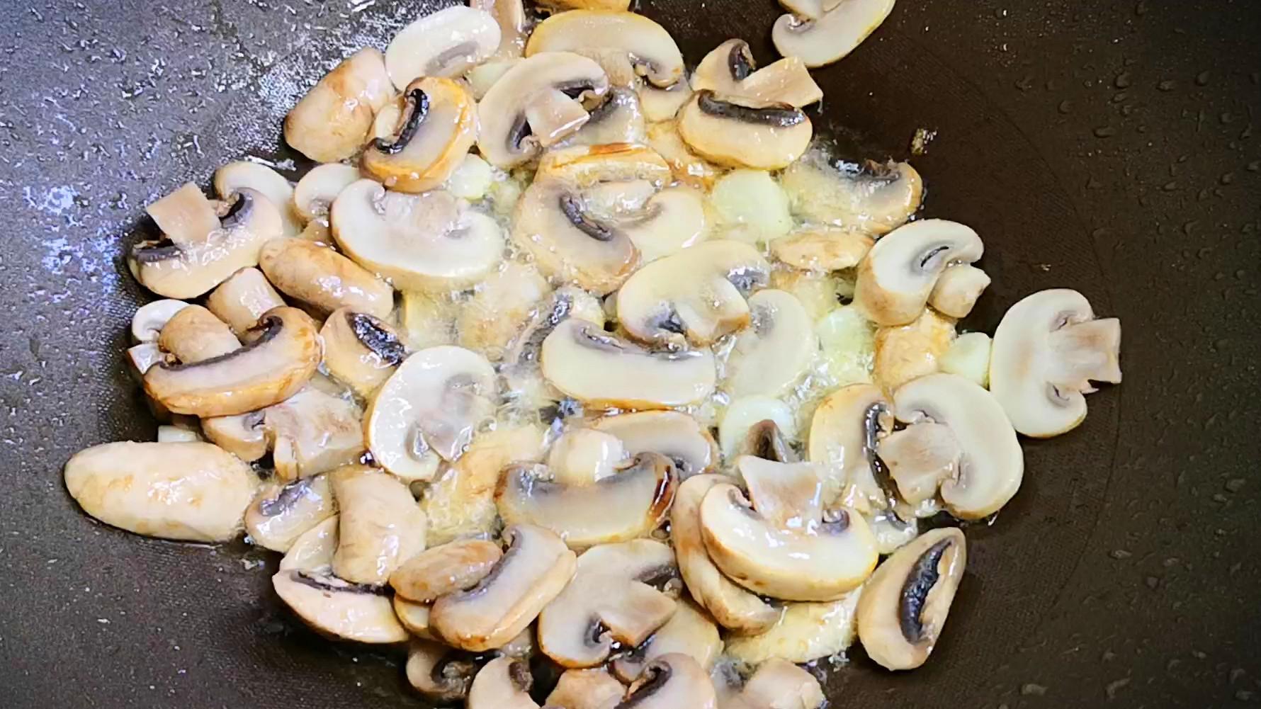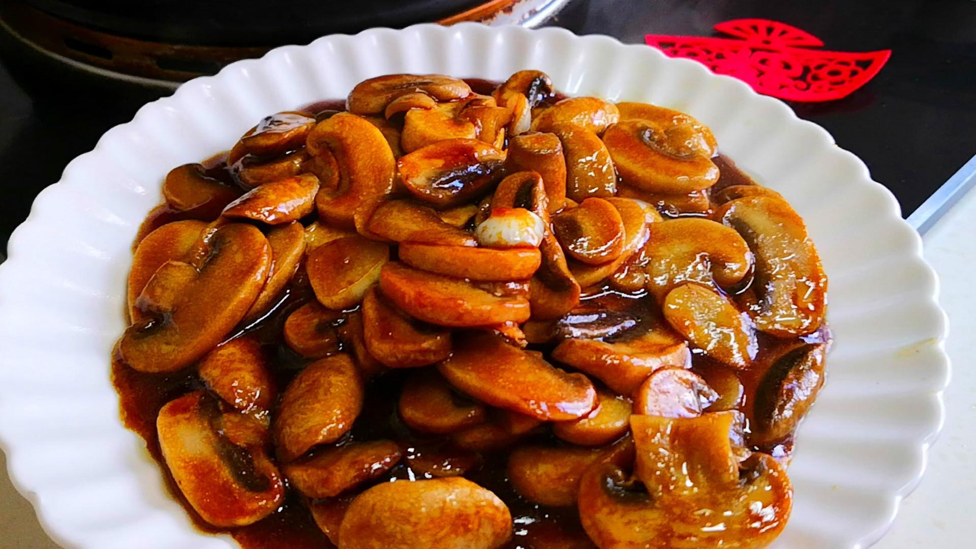 三、起鍋加油,油溫五成熱放入蒜片,爆香後放入口蘑,將口蘑用鏟子攤平,鋪到鍋底煎一煎,煎至口蘑微微發黃發焦時倒入調好的料汁,然後滴入兩滴老抽調色,大火翻炒至料汁被完全吸收後關火,裝盤即可。