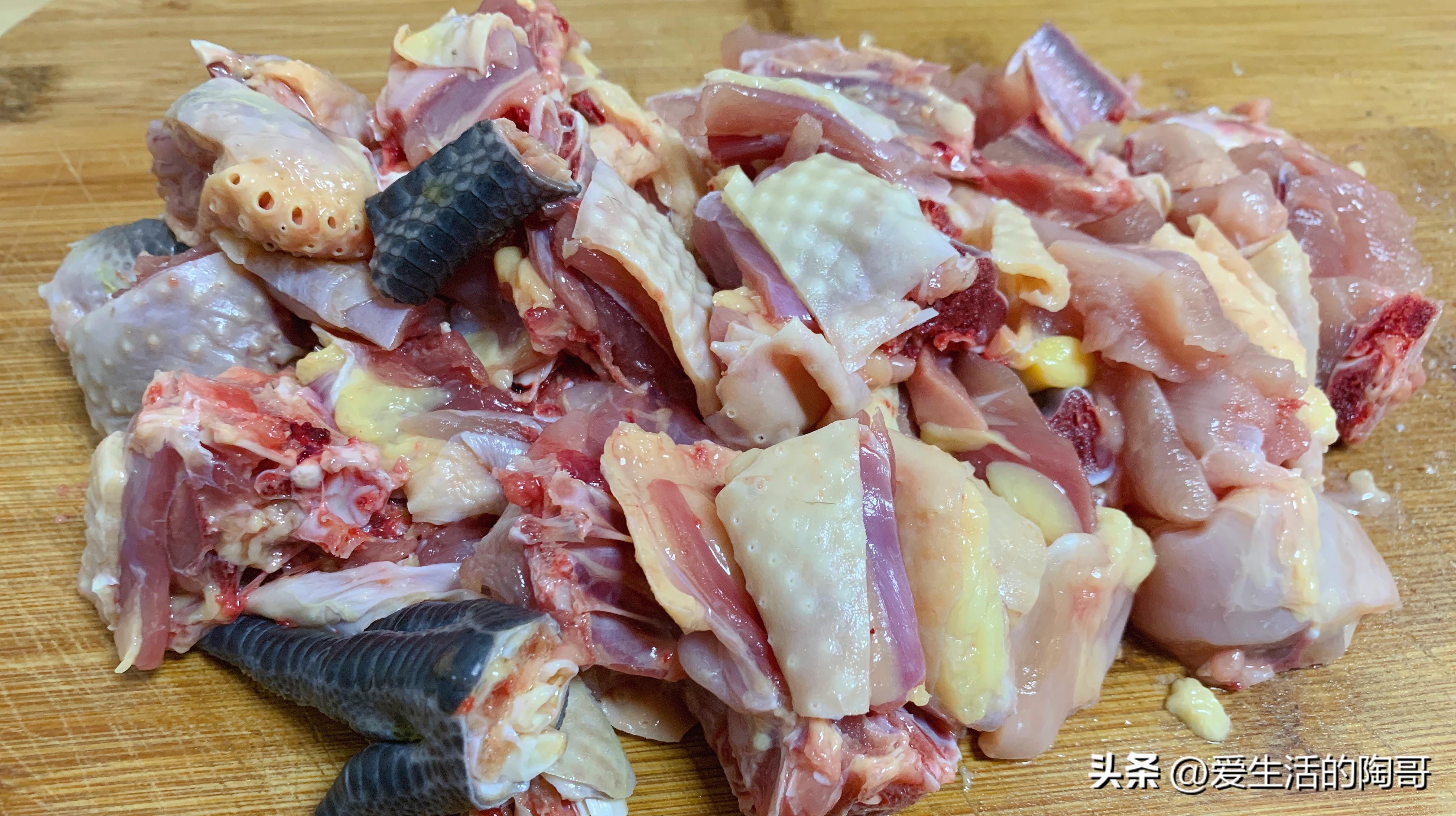 2雞肉沖洗,切塊,放進水裏去除多餘的血水,這樣雞肉喫起來不腥,儘量不要焯水,焯水後的雞肉喫起來柴