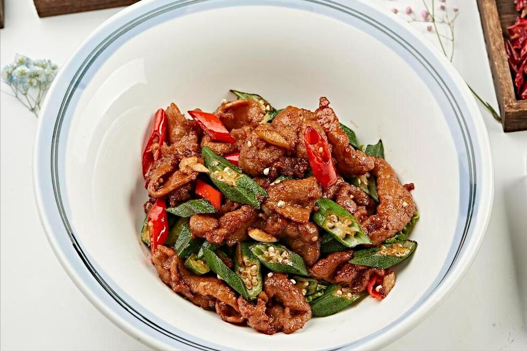 4、緊接着倒入豬肉開始翻炒,直至將豬肉整體炒到發白爲止,隨後再把秋葵給倒進去,保持中大火開始不停翻炒。炒製片刻以後,我們來進行調味,加入適量的醬油、蠔油、鹽、雞精進行調味,繼續翻炒幾下,翻炒均勻之後就可以出鍋啦,清香又有營養,老少皆宜,秋天別不懂喫。