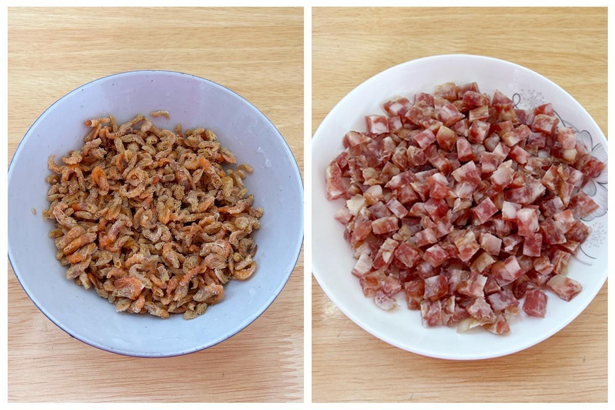 小蝦仁用水浸泡10分鐘,反覆清洗乾淨,瀝乾水分,廣式臘腸切成小丁,香蔥切成顆粒。