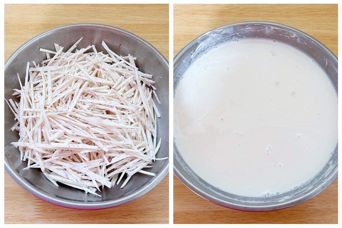 荔浦芋頭去皮,用工具刨成絲,如果沒有工具,先把芋頭切薄片,再改刀切成絲。粘米粉加水,加適量的鹽混合成沒有乾粉和顆粒物的粉漿。粘米粉和水的比例,大約是1:1.5,具體用水量,建議根據粘米粉的吸水程度來調整。