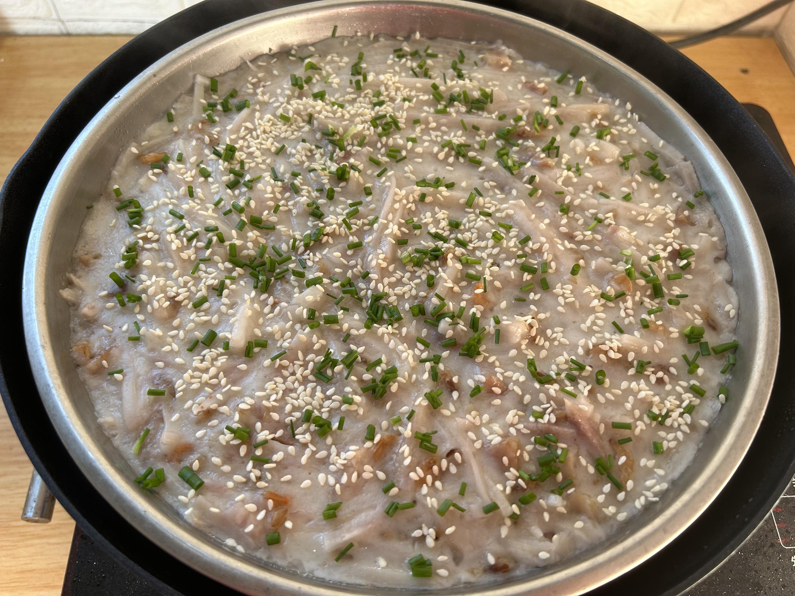 把混合芋頭絲和粘米粉漿的麪糊裝到盤子裏,大火隔水蒸20分鐘左右,撒上白芝麻和香蔥顆粒,好喫的芋頭糕就做好了。芋頭糕半成品蒸的時間,根據容器的大小和口徑靈活調整時間。盤子開口越大,蒸的時間越短,盤子越深,蒸的時間越長。