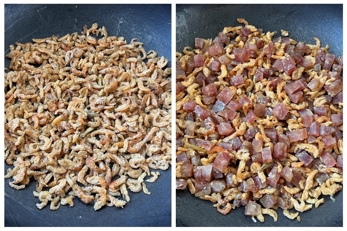 熱鍋放油,放入小蝦仁和料酒翻炒均勻去腥味,加入廣式臘腸翻炒出香味。