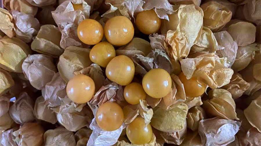 家菇娘一般都是黃色,這種菇娘成熟後表皮發亮,口味酸甜可口,是連籽一起喫的,非常的過癮。而野菇娘一般是紅色的,顏色很漂亮,也很喜慶,就像一個新娘披着婚紗,但是口味略微有些苦。