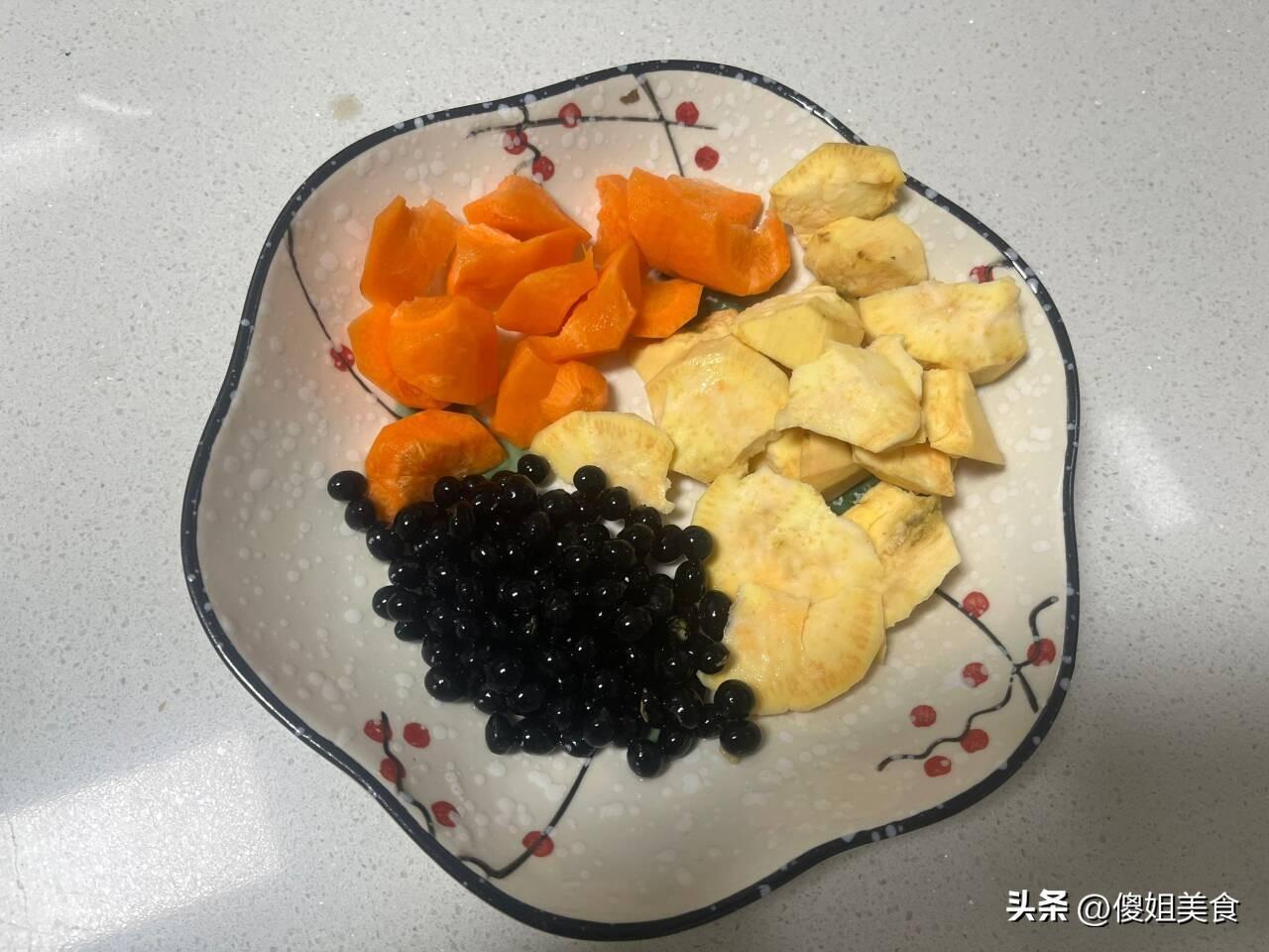 早上喝粥這是我家必喝的,孩子們不喜歡喝煮的粥,我就會給他們用豆漿機打成米糊喝,這樣孩子們就特別愛喝,還省事。提前一晚上把需要的食材都準備好。我準備的有紅薯、胡蘿蔔、黑豆這三樣食材,食材清洗乾淨切好就可以,量不要太多,根據豆漿機的大小準備就可以。