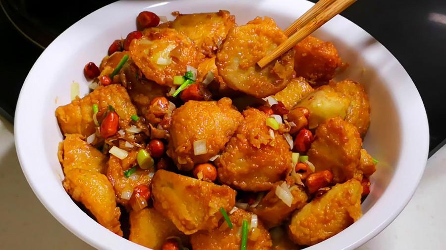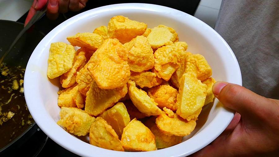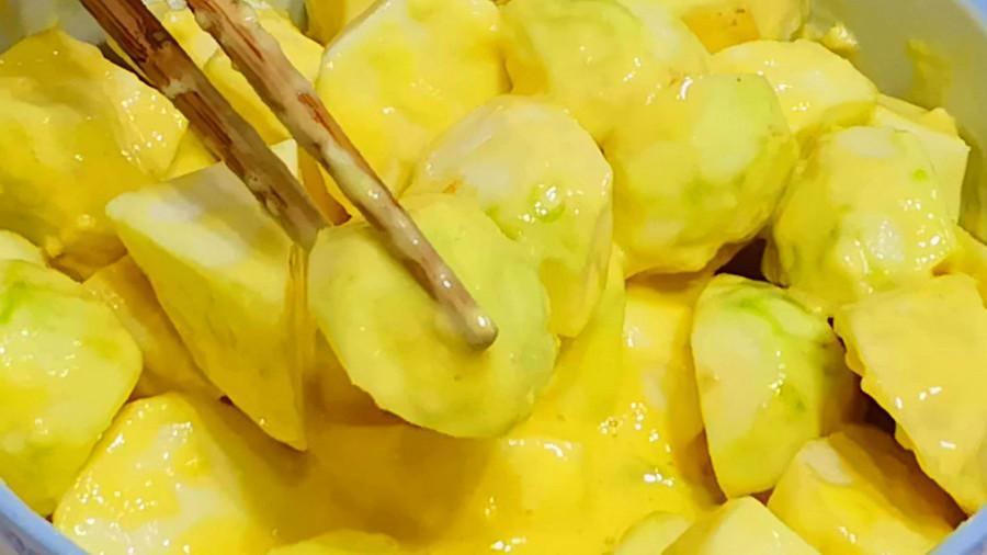 4.然後起鍋加油,油要多一些,油溫燒至5~6成熱(用一根筷子豎着放到油鍋中,看到筷子周圍出現密集的小泡時,油溫即可)時下入掛滿糊的芋頭塊,中小火將芋頭塊炸至表皮呈金黃色,即可控油撈出。如果芋頭較多,可以分次炸炸制,不要一下放入太多。