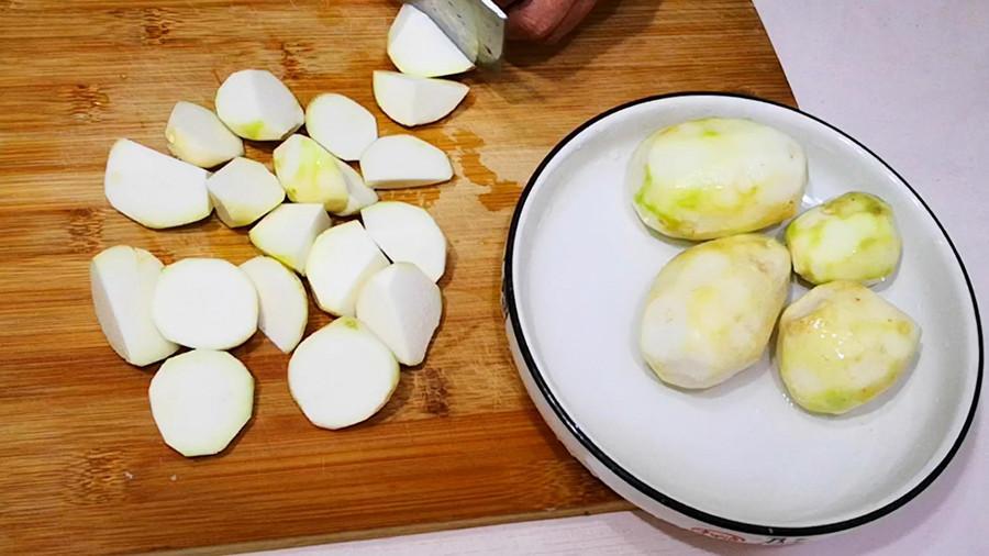 1.選取新鮮飽滿的芋頭,先用削皮刀順着芋頭的紋理慢慢地削去外皮,然後用清水多衝洗幾遍,控幹水分後再切成小塊備用。如果對芋頭的粘液過敏,這一步建議戴着手套操作。