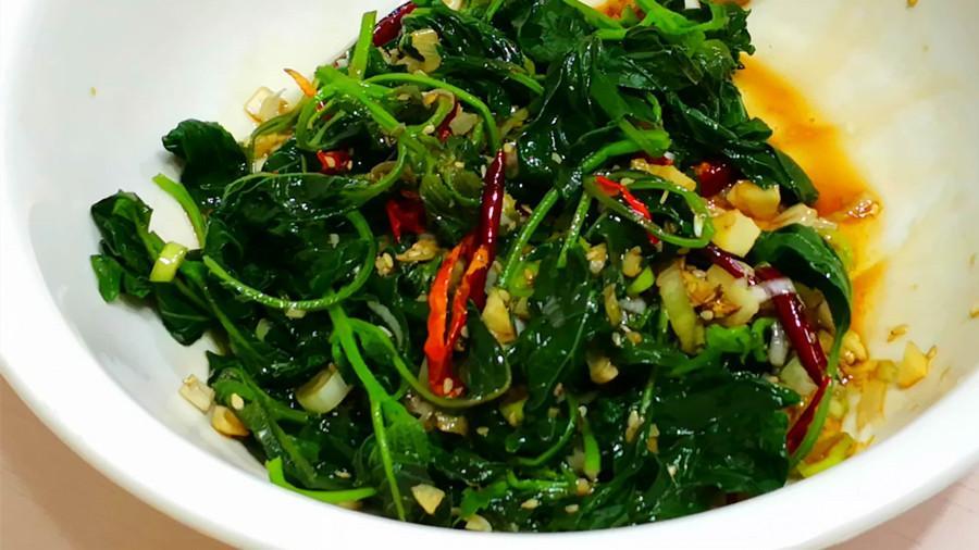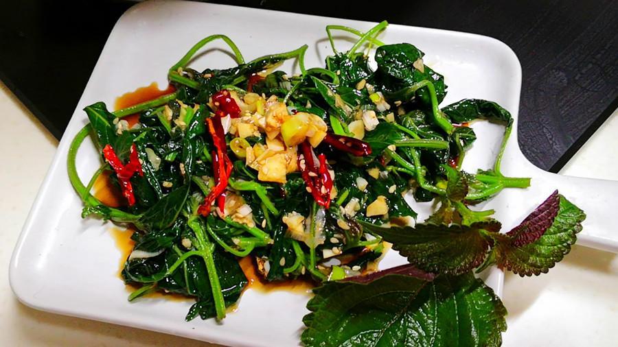 2、幾瓣大蒜拍扁然後剁細,一棵小蔥切成蔥花,2根幹辣椒切絲,然後一起放到裝有紫蘇葉的碗中,再加入一勺白芝麻,然後澆上一勺燒至冒煙的熱油,這時香味便會飄散開來,再加入味極鮮、鹽、白糖和米醋、香油調味,攪拌均勻後裝盤即可。