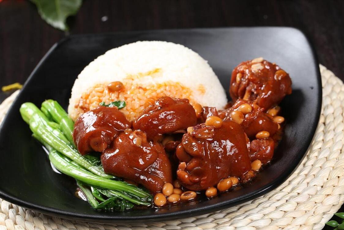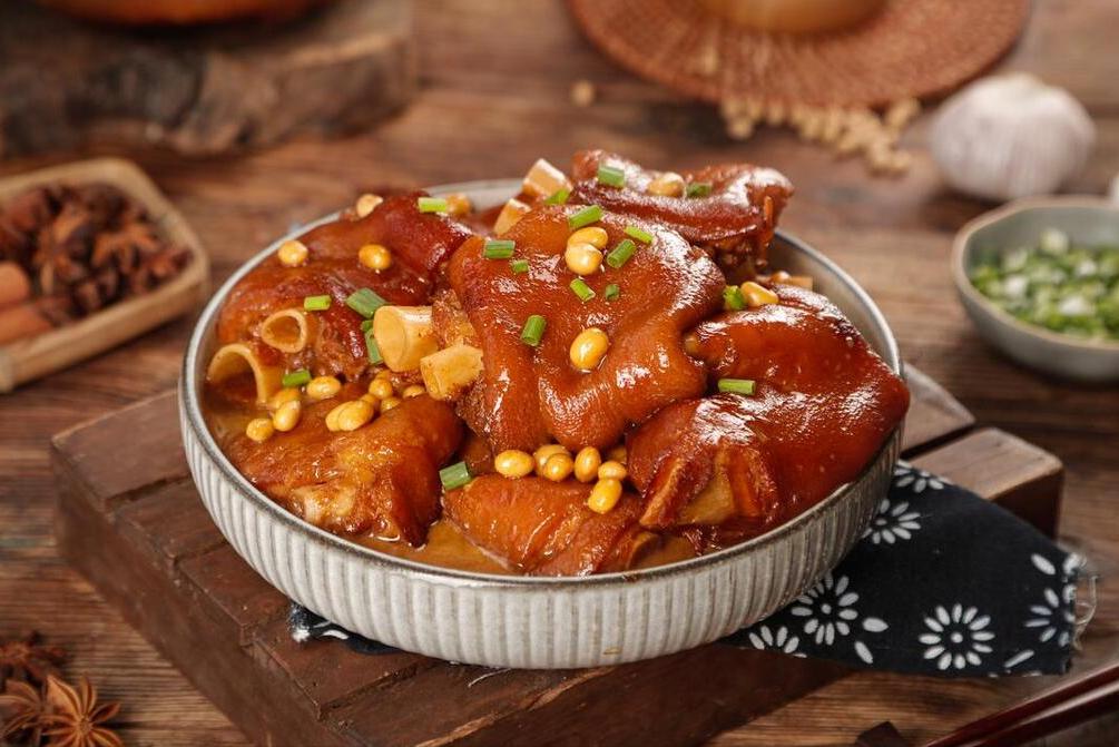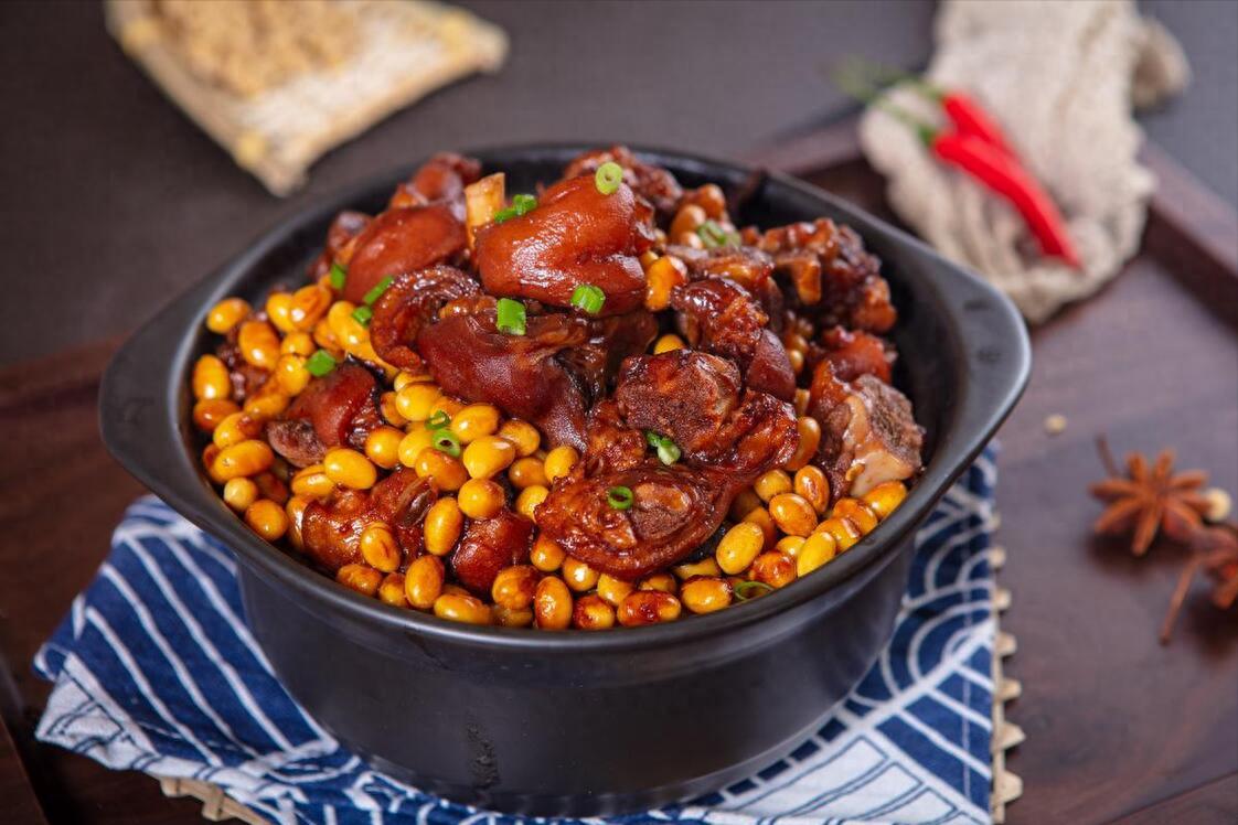 食材:黃豆、豬蹄、八角、蔥姜、鹽、味精、冰糖、生抽、老抽、料酒、食用油