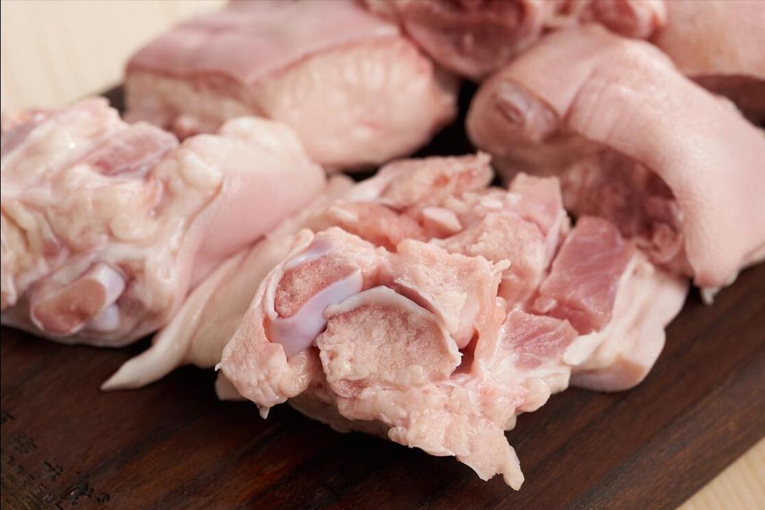 2、之後再來處理豬蹄,將豬蹄切成小塊以後,放在水中浸泡半個小時左右,將多餘的髒東西泡出來,隨後再將其沖洗幾遍,撈出來之後就可以倒入鍋中了,來準備焯水。往鍋內加上薑片、料酒進行焯水,焯水後撈出來,用溫水沖洗乾淨。