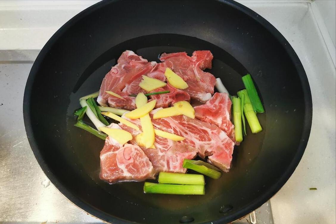 5、接下來將排骨倒在鍋子裏,加上薑片、開水開始煮,大火燒開之後,改爲小火煮上30分鐘左右,隨後再把蓮藕倒入其中繼續煮,接着再煮上30分鐘左右就差不多了,可以用筷子插一下,感受一下蓮藕的粉糯程度。