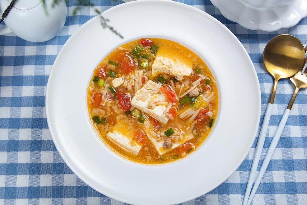 番茄切成小塊,金針菇切掉根部後洗淨,豆腐切塊,蔥花和大蒜都切好。鍋內倒油,燒熱下入蒜末炒香,然後倒入番茄翻炒,炒到斷生後下入金針菇繼續炒,變軟後添上一鍋清水燒開,然後下入豆腐,順便來點鹽和雞精,燉上20分鐘後,撒上蔥花出鍋。