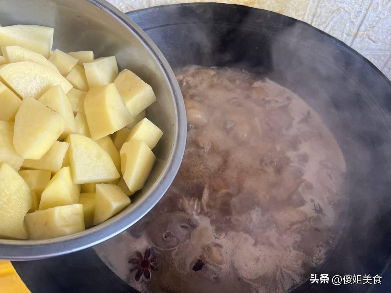 準備一個土豆去皮後切成塊,然後沖洗乾淨裏面的澱粉。雞肉燉20分鐘後撒上適量的鹽,再把土豆塊放進去,繼續中火燉,把土豆燉的軟綿一些,喫這看口感也好。最後大火收下湯汁,雞肉軟爛入味,土豆軟綿好喫,剁點蒜末放進去,攪拌均勻後把雞肉盛出來就可以。