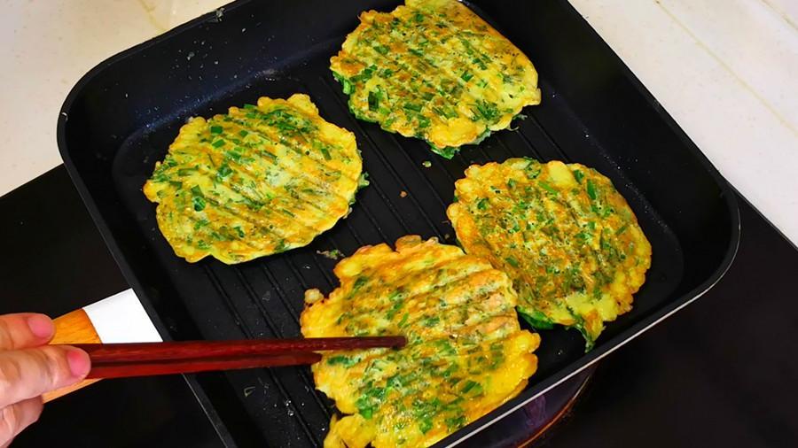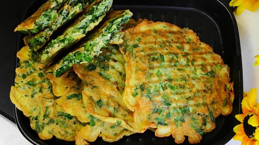 2.平底鍋刷油,燒熱後轉成小火,然後用勺子把調好的韭菜麪糊舀到鍋中,將麪糊整理成一個個厚薄均勻的小餅。然後再轉成中火烙制,烙至一面金黃後再翻面繼續烙,烙至兩面都呈金黃色時即可出鍋,美味即成,簡單又營養的韭菜早餐餅就做好了,上桌大人孩子搶着喫!