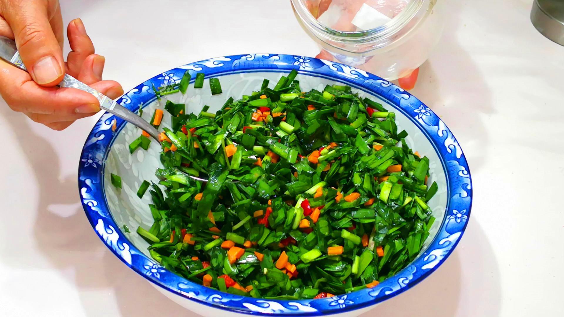 4.鍋內加水,燒開後加入一勺食鹽、滴入幾滴食用油,將切好的韭菜頭先放入,大約焯燙10秒後再放入韭菜葉子,繼續焯燙10秒後,撈出過涼開水(焯燙可以去除韭菜的辛辣味;過涼水可以使韭菜顏色保持翠綠不發黃),然後撈出控幹水分後裝盤,放入切好的紅椒碎,接着把調好的涼拌汁倒入,攪拌均勻讓韭菜充分入味後即可食用,鮮美又下飯!