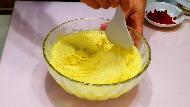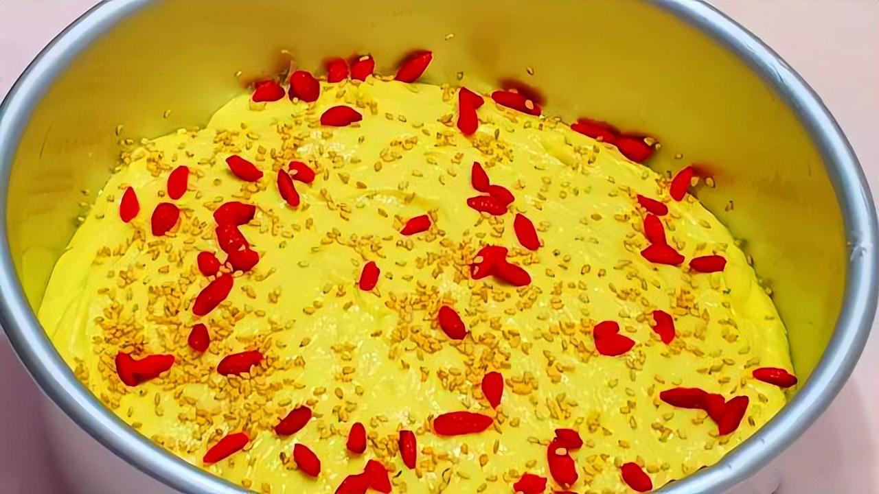 5.然後我們取一個做蛋糕用的模具,內壁塗上一層食用油防止粘連,再把攪拌好的麪糊倒入模具中,將模具振動幾下,如果不夠平整,再用鏟子整理一下,接着撒上適量的枸杞和白芝麻(也可以撒各種自己喜歡喫的乾果),再把它放到溫暖的地方二次醒發15分鐘左右。