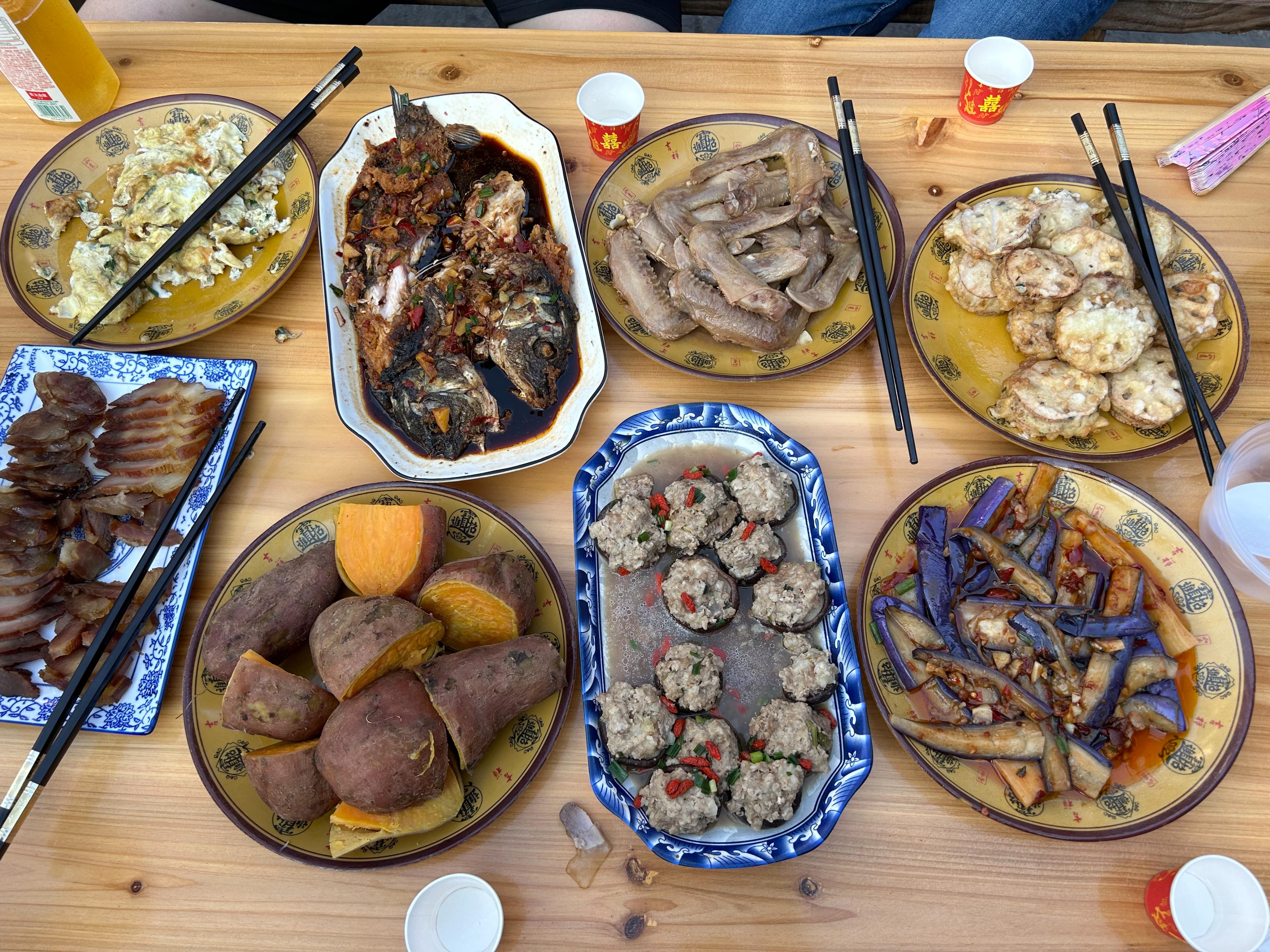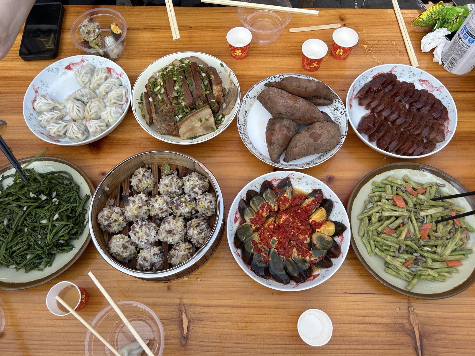 串到隔壁桌,這一桌同樣是八樣美食,有臘腸、紅薯、荔浦芋扣肉、蒸餃、素炒豆角、涼拌皮蛋、三色糯米肉丸、素炒青菜。嚐了下臘腸,鹹了一點,我個人還挺喜歡那個糯米肉丸的,喫了3個,很合我的胃口。蒸餃捏的形狀是柳葉形,還挺好看的。