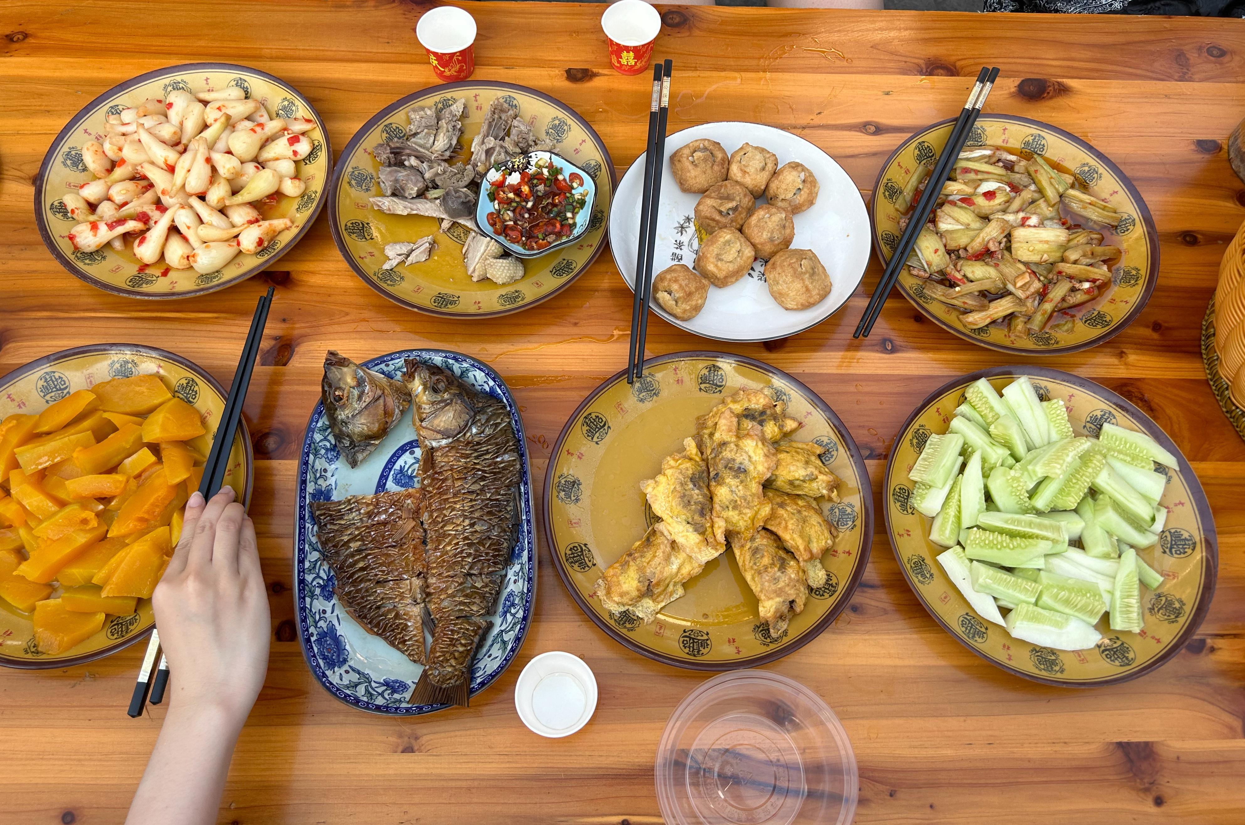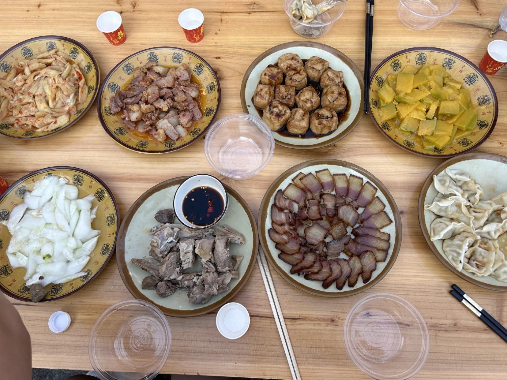 第一桌是我當時找位坐的地方,這桌的美食有8道,分別是蒸餃、當地自制的臘肉、白切鴨、南瓜、釀豆腐、白肉黃瓜,辣白菜和酸肉。當地的臘肉還挺香的,不過我喫不慣酸肉,感覺味道有點怪怪的。
