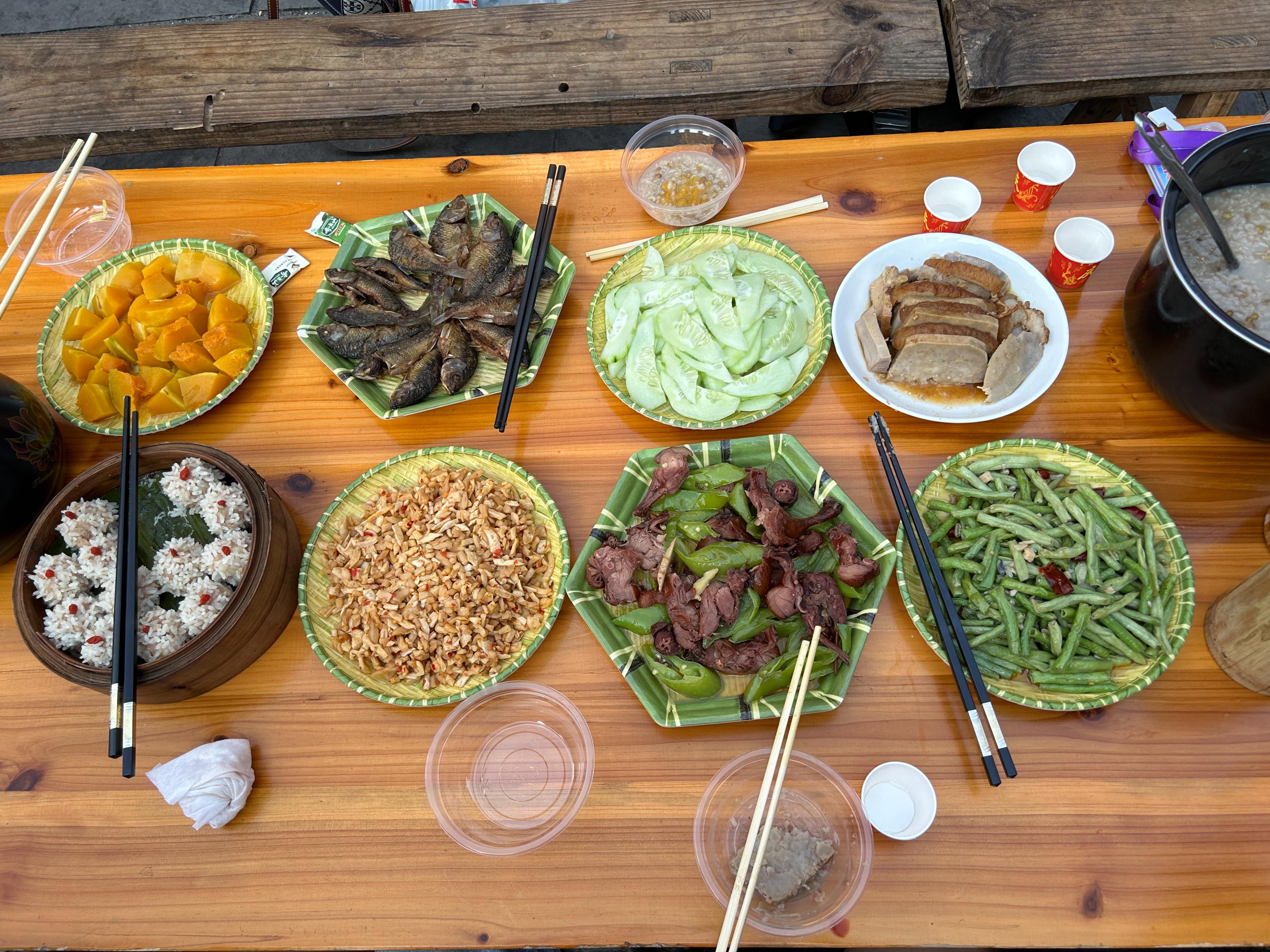 第三桌有炒芋苗、釀豆腐、白切鴨、酸藠頭、南瓜、禾花魚、蛋餃、去皮的黃瓜。我這一桌我嚐了一下芋苗,喫起來挺脆的。由於百家宴是幾十位當地的廚娘做菜,有時候會有一些相同的菜品。