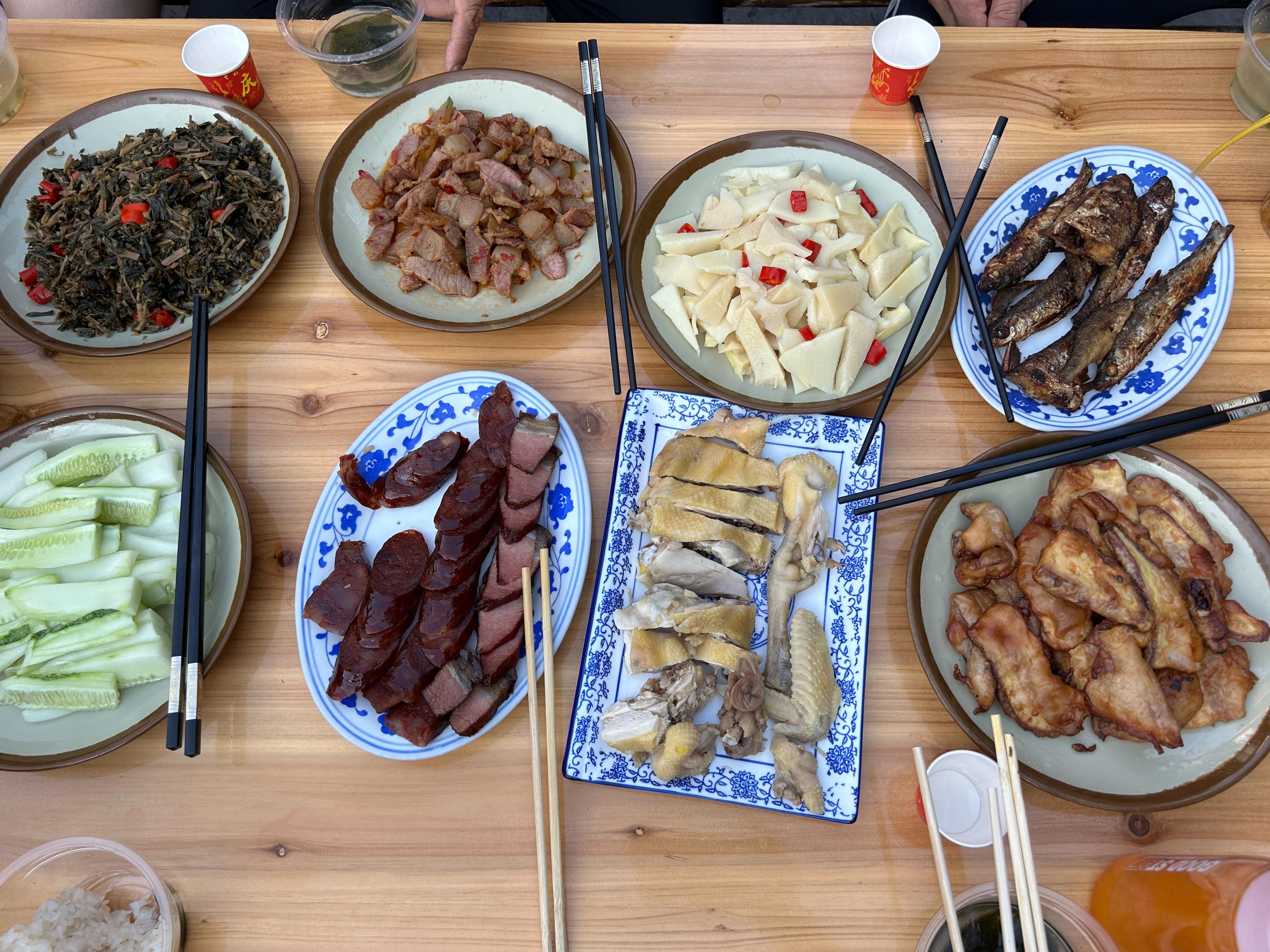 第六桌的美食有煙燻小魚乾、素炒筍片、酸肉、黃瓜、臘味雙拼、白切雞,左上角那個忘了是什麼,右下角的像是油炸的,怕上火沒敢喫。除了這些美食,還有很多沒拍到,我這次參加的百家宴大約有30桌,有一大半是團隊旅遊,還有一部分是散客,據我觀察,團隊餐的美食會好一些,菜品也更豐富,當然全場都是可以隨意喫的。