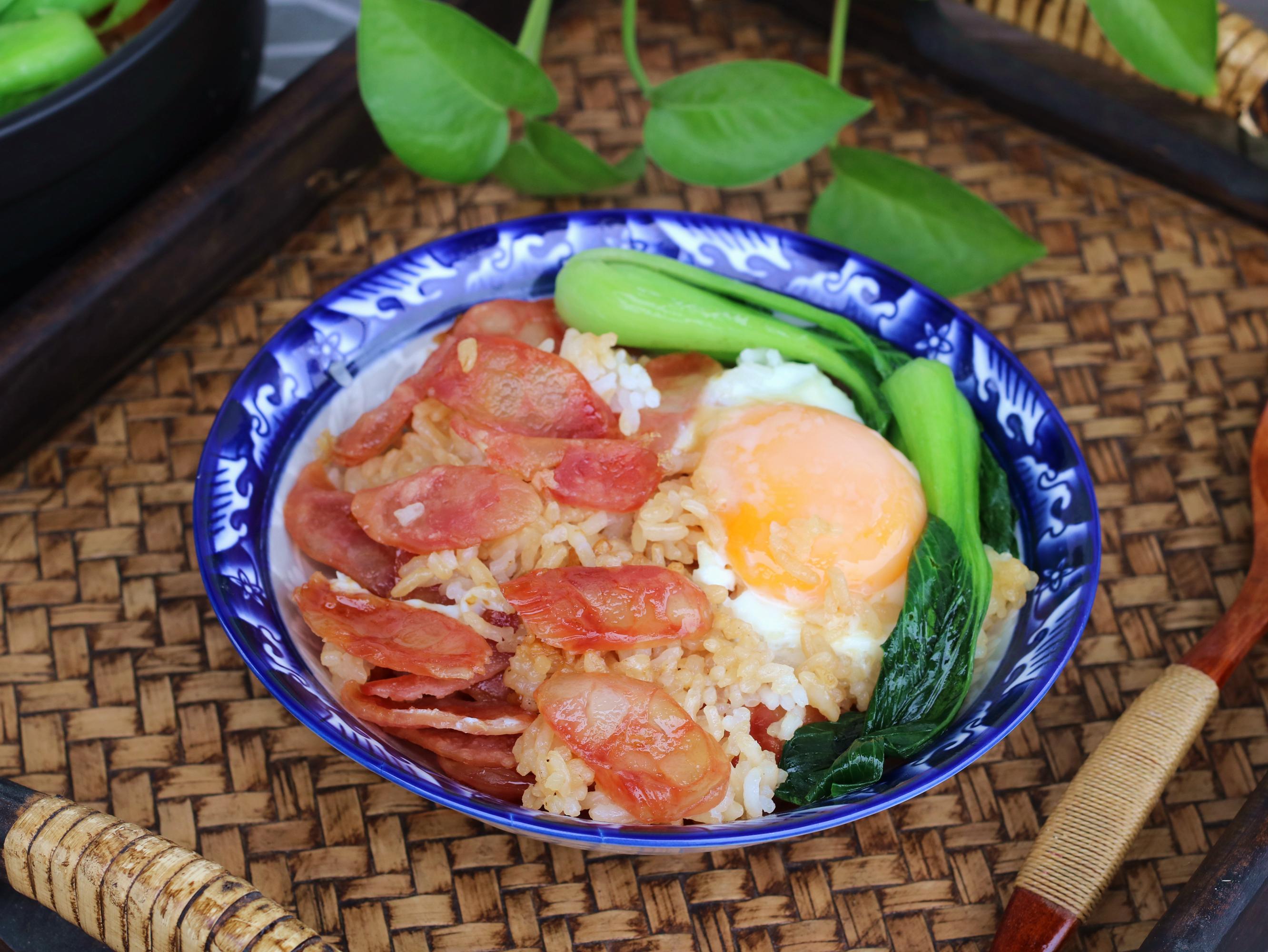 食材:大米、雞蛋、廣式臘腸、上海青、食用油、生抽、蠔油、芝麻油、白砂糖