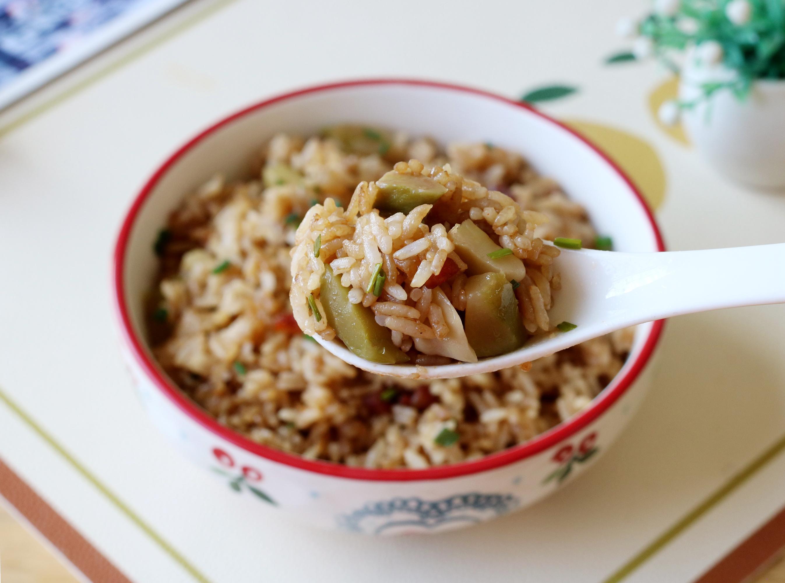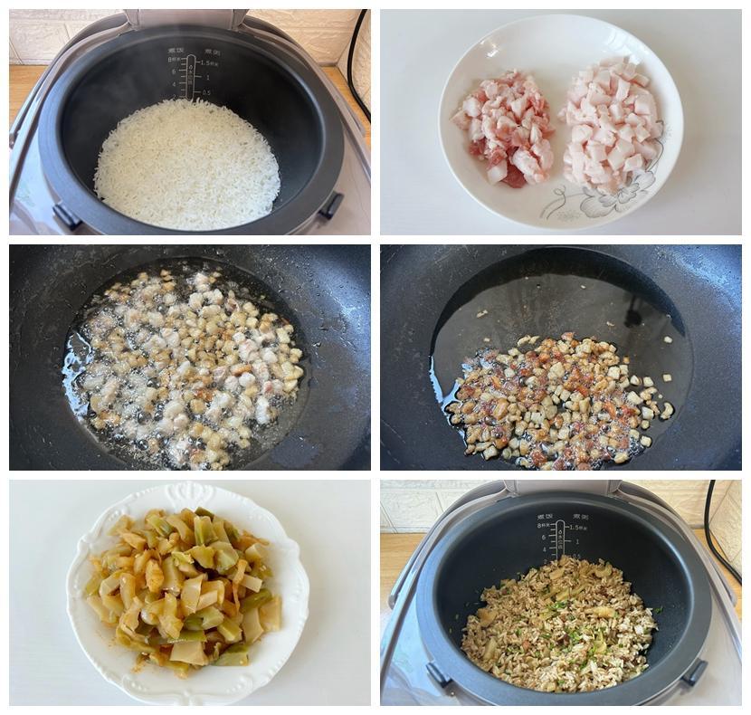 3,榨菜切成顆粒,米飯煮熟後放入榨菜、2勺豬油、一部分油渣,加入生抽翻拌均勻。