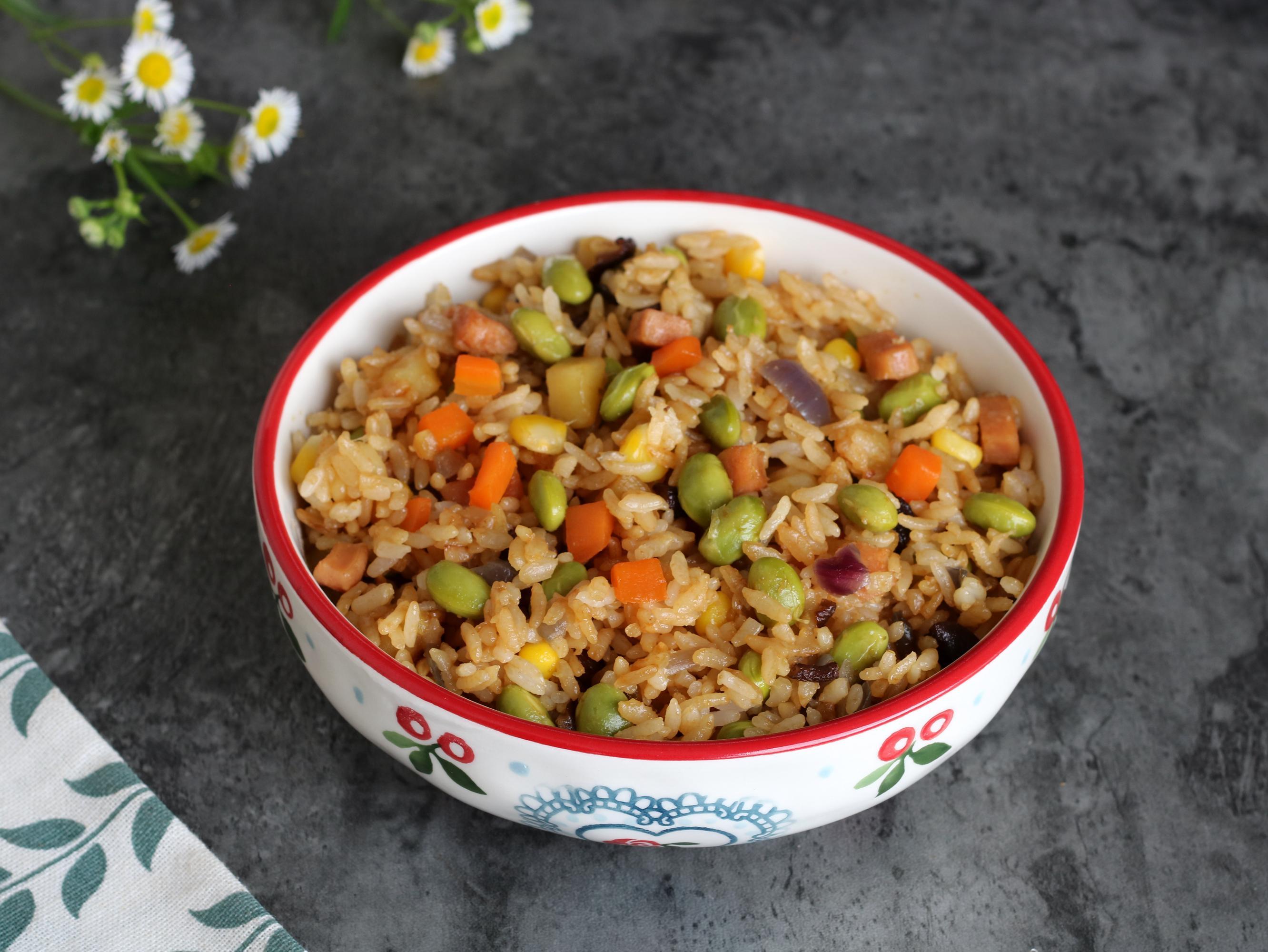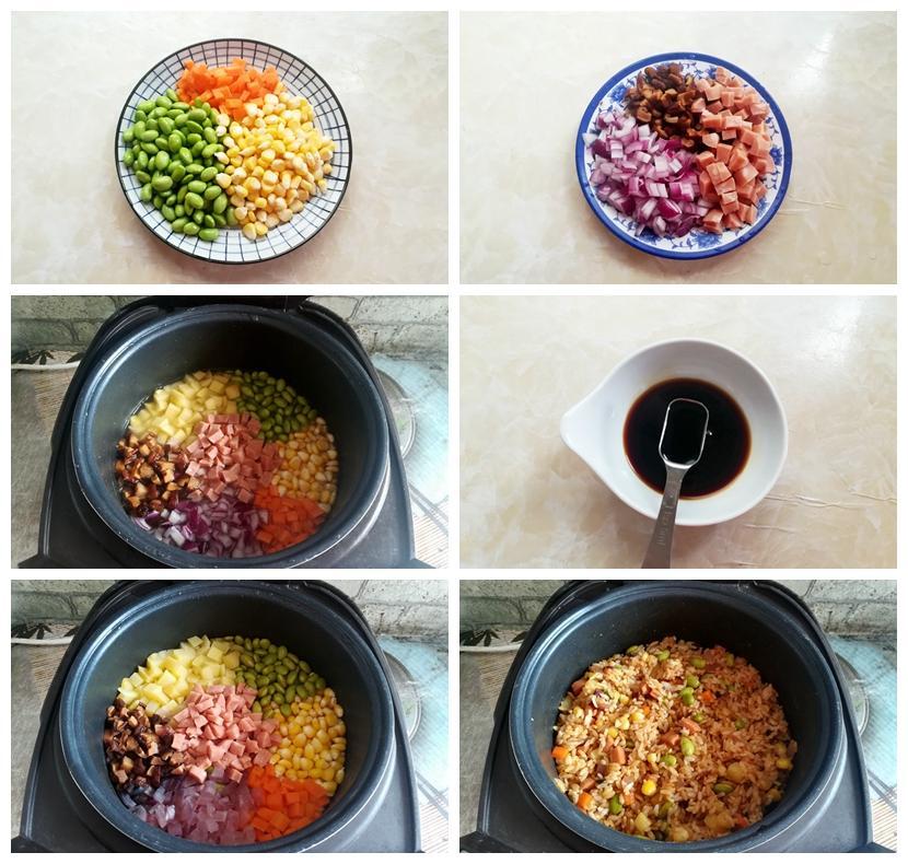 食材:大米、青豆、玉米、胡蘿蔔、洋蔥、土豆、幹香菇、火腿腸,生抽、老抽、蠔油