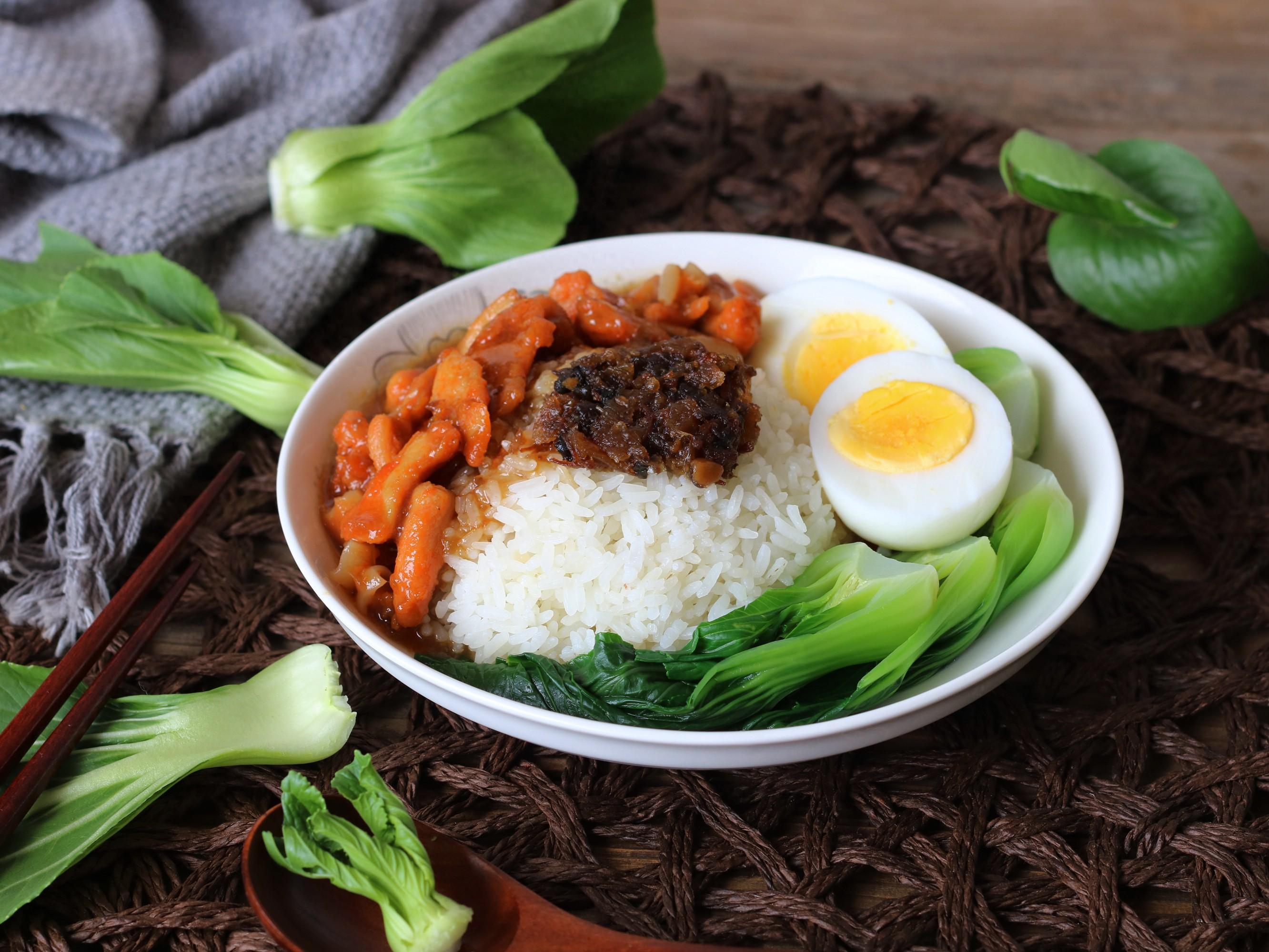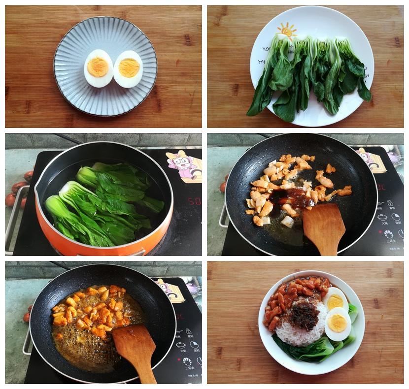 4,盛一碗米飯,放上焯過水的上海青、雞蛋和骨肉相連,加一勺八珍醬,沒有可以不加。