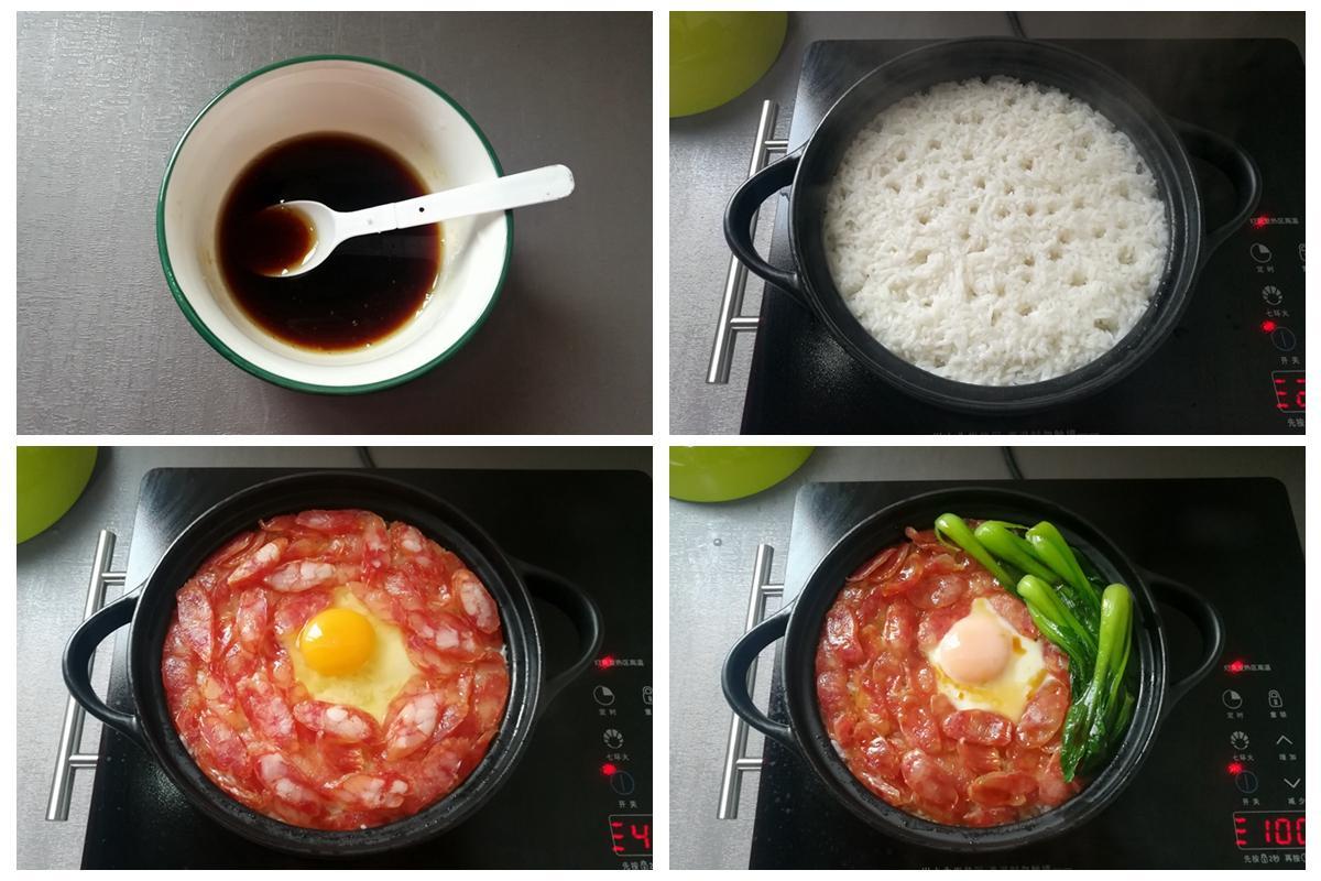 5,調中火,把廣式臘腸平鋪放到米飯上,中間留出空位敲一個雞蛋。