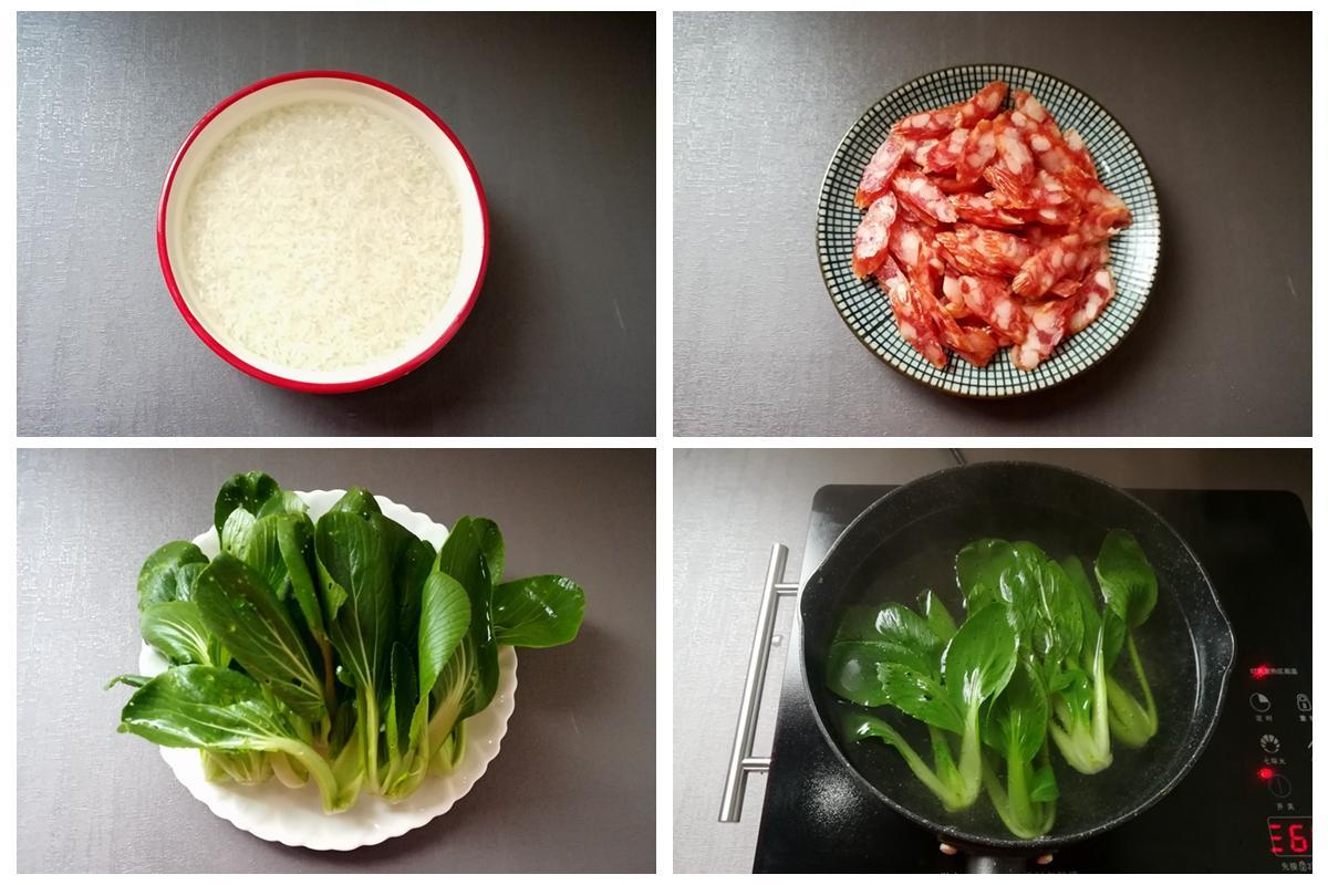 2,廣式臘腸斜着切成薄片,上海青清洗乾淨,放到熱開水裏焯水斷生,撈出來瀝乾水分。