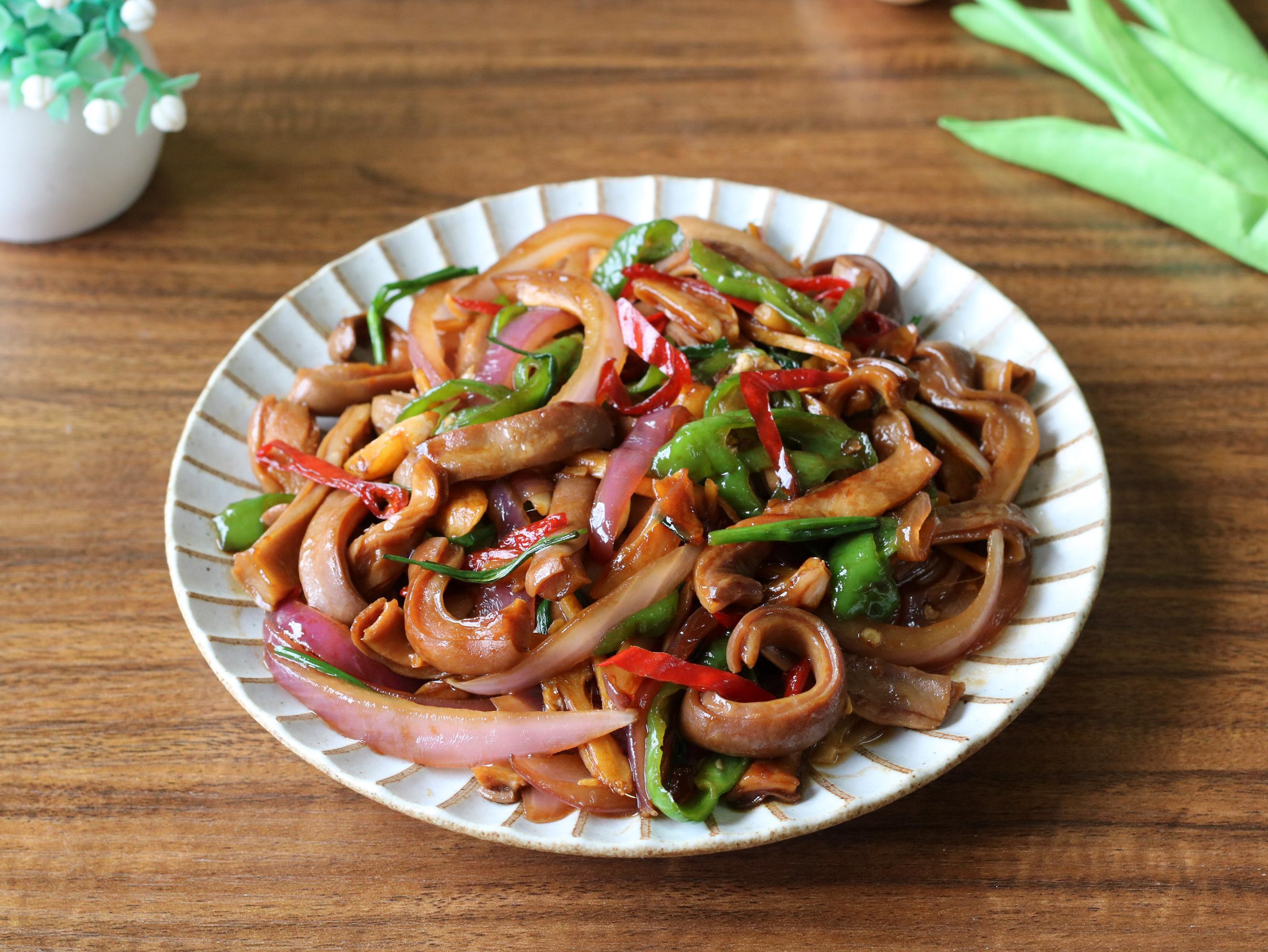 加入洋蔥和青辣椒翻炒到斷生,一道營養好喫的爆炒豬肚就做好了。