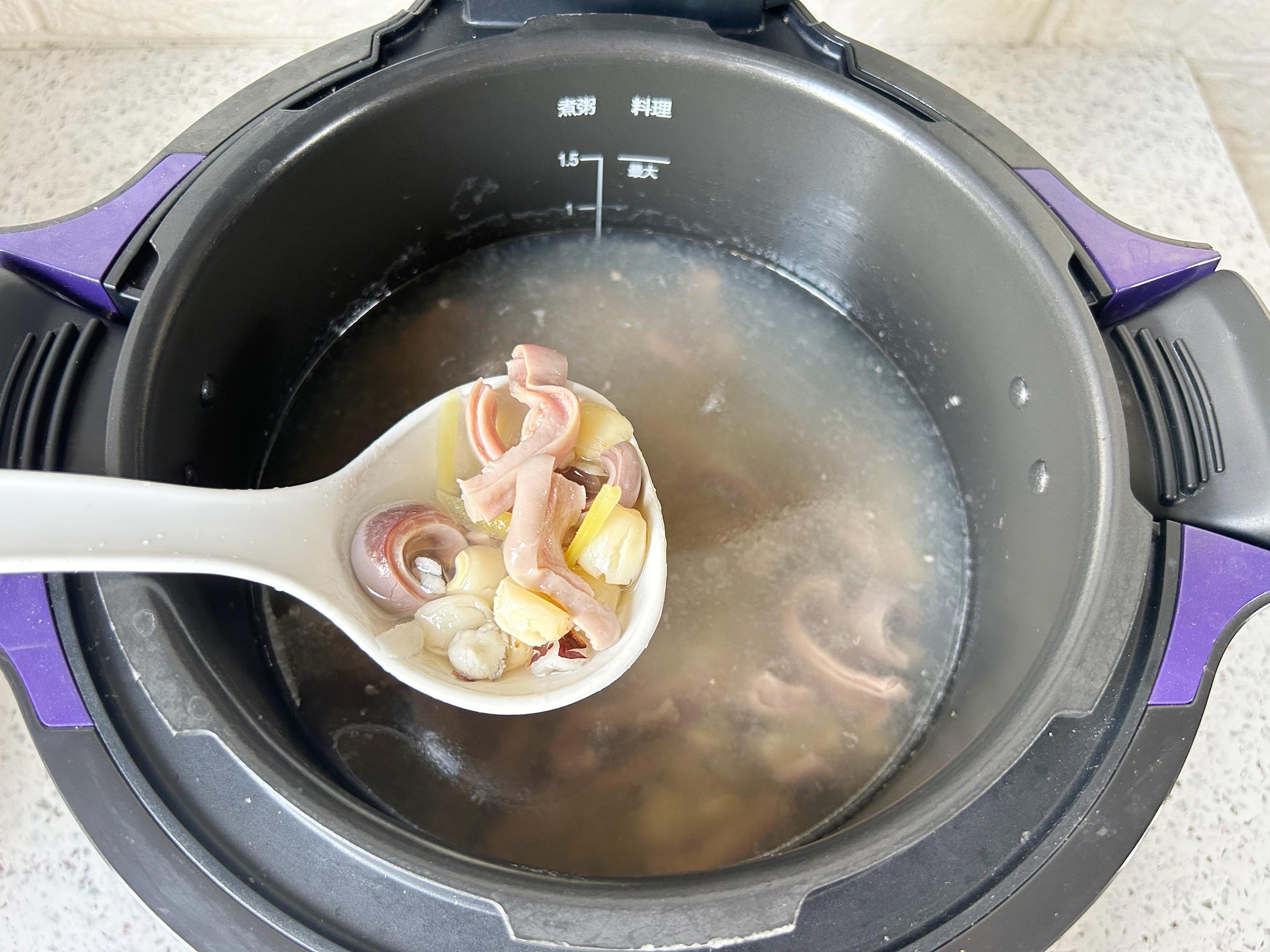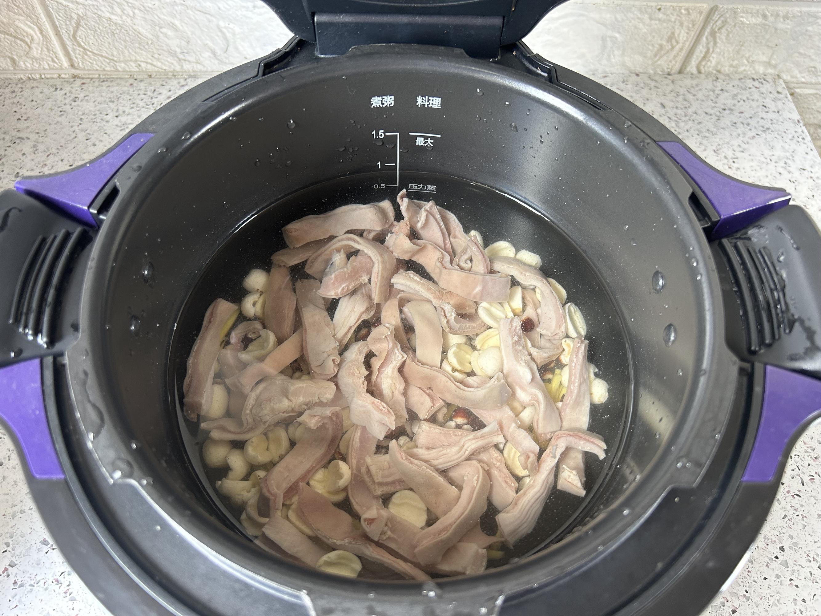 把蓮子、芡實、薑絲和豬肚一起放入電壓力鍋裏,選擇煲湯程序,大約25分鐘。