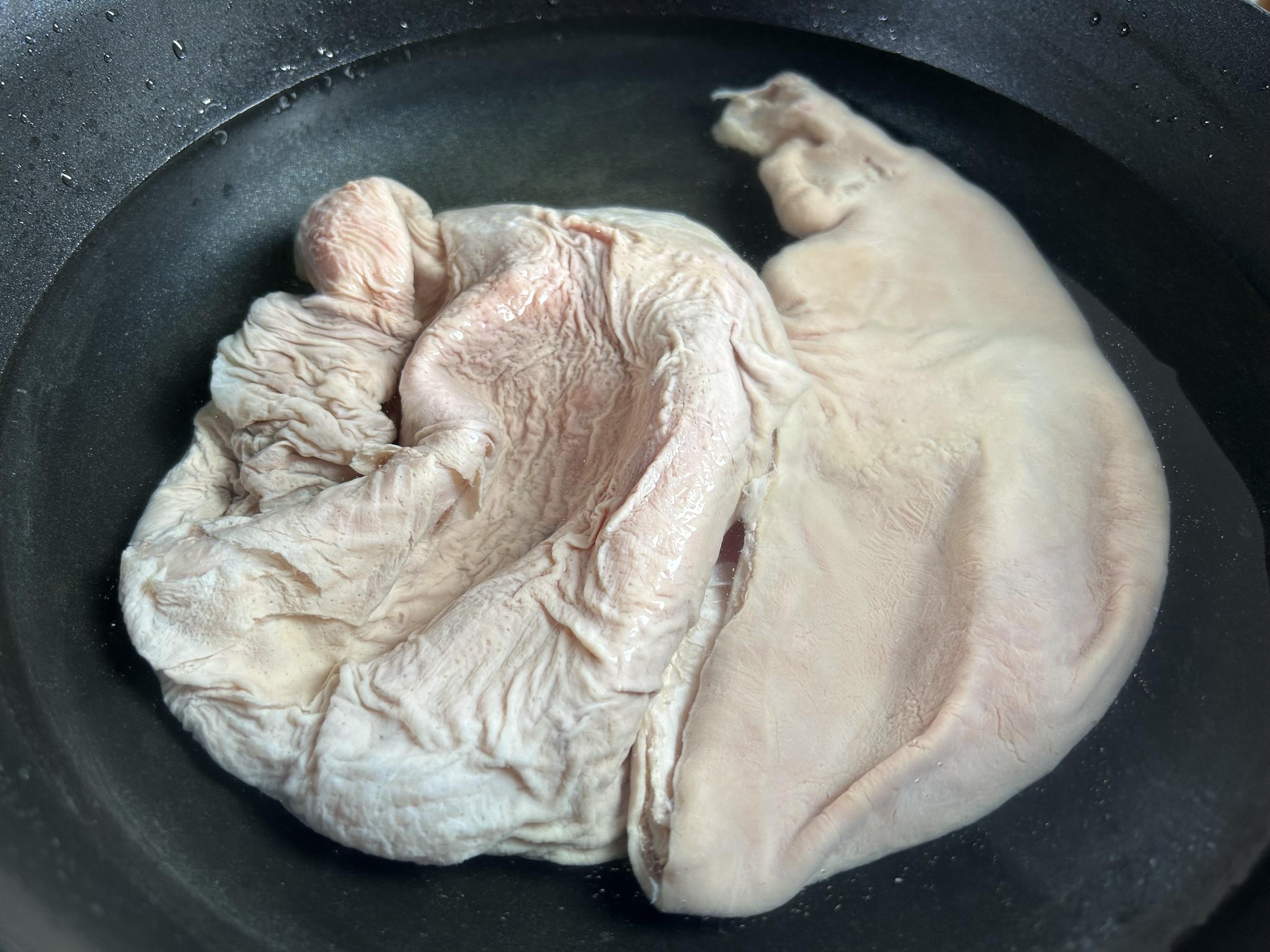 清洗好的豬肚,冷水進鍋,加入料酒,中火加熱煮到變硬,撈出來洗掉浮沫。