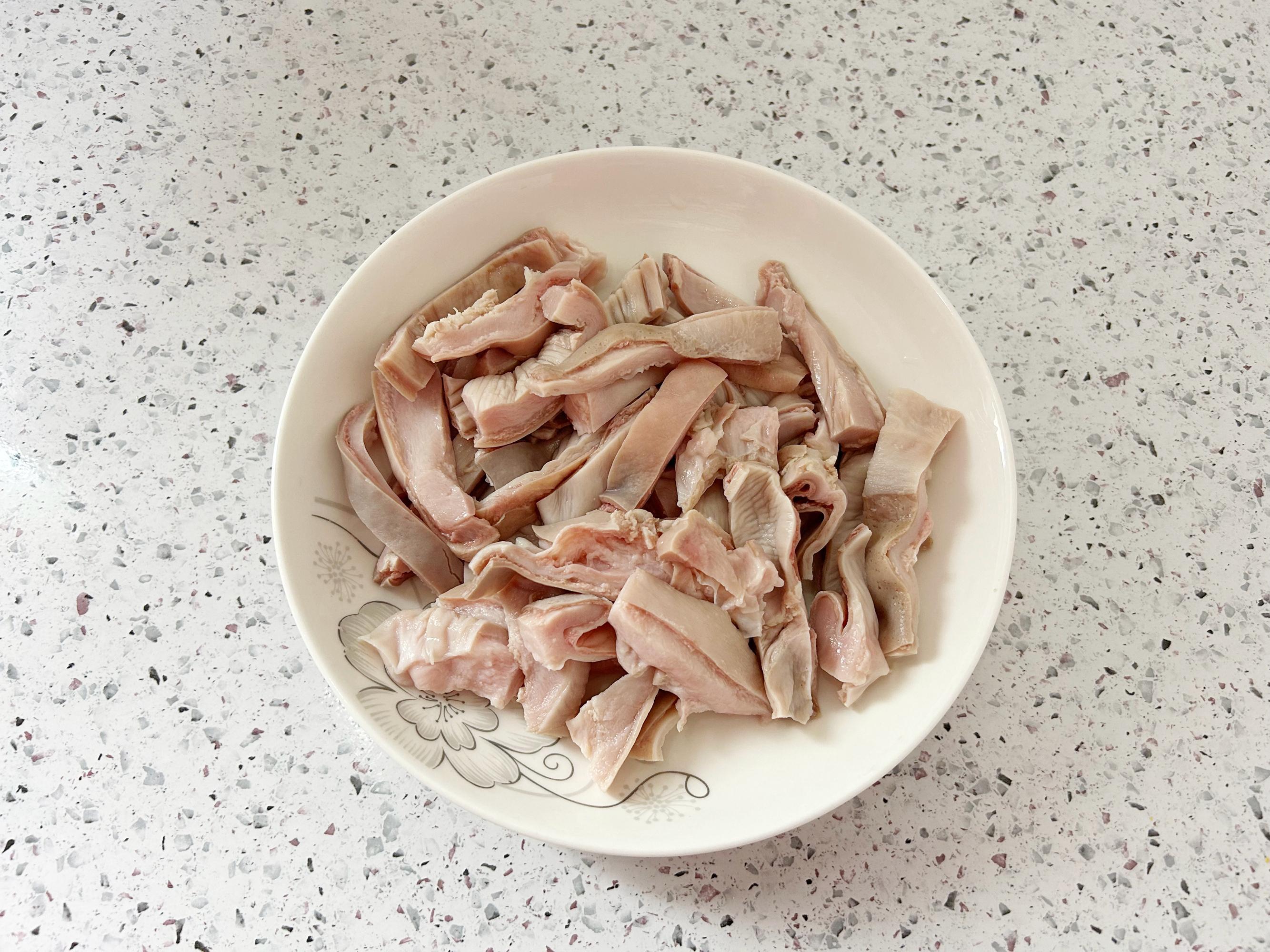 豬肚切成合適的長度,生薑去皮切絲,香蔥只要葉子,切成顆粒。