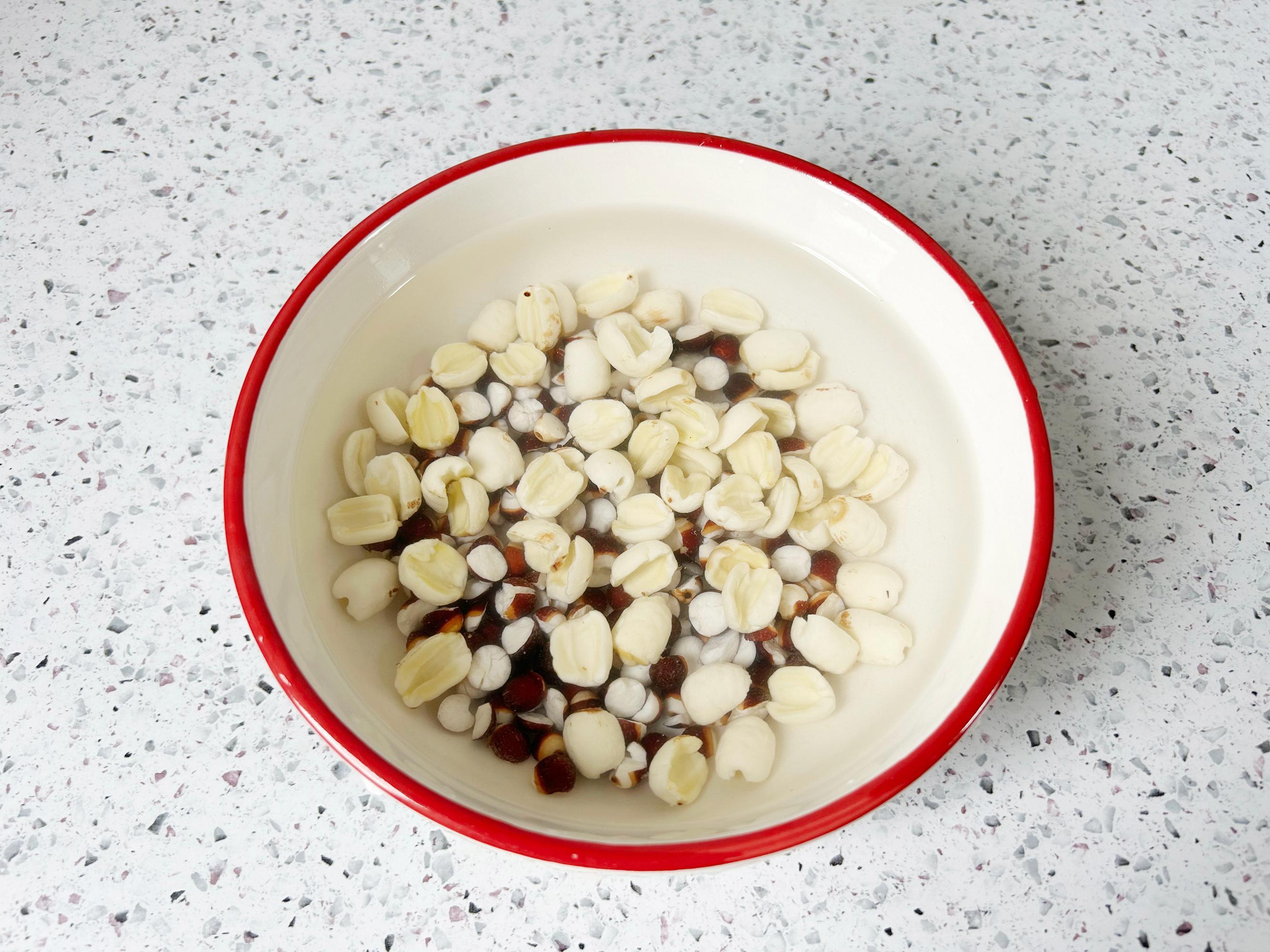 處理豬肚的同時,把芡實、蓮子浸泡半個小時左右,泡好後把蓮子掰開,去掉可能殘留的蓮子芯。