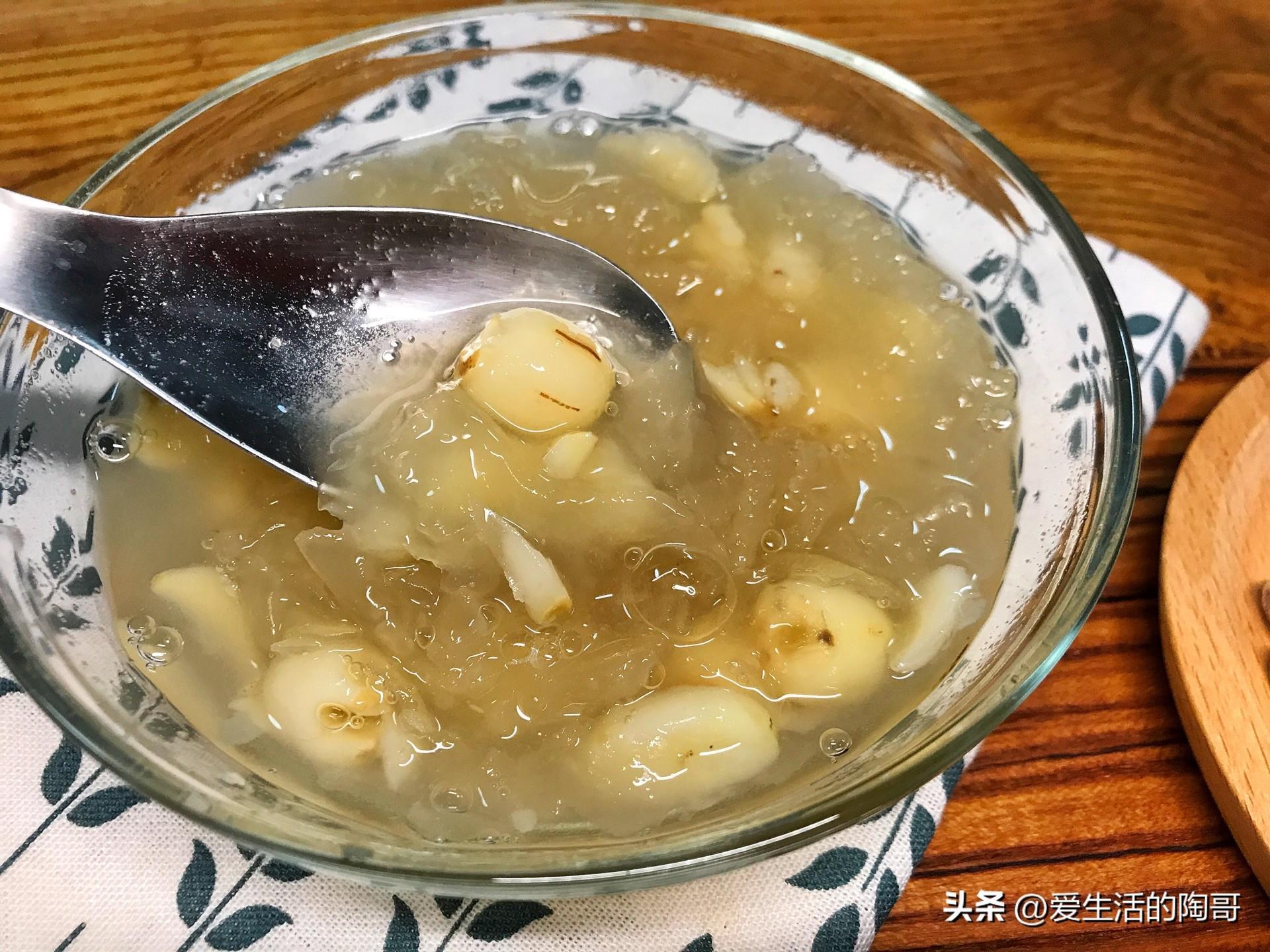 4種白色的食物一起做湯喝。蓮子,銀耳,百合,陳皮。這道湯也叫“潤肺湯”。幾種食物一起搭配,滋陰養肺,清心安神,解秋乏防秋燥。