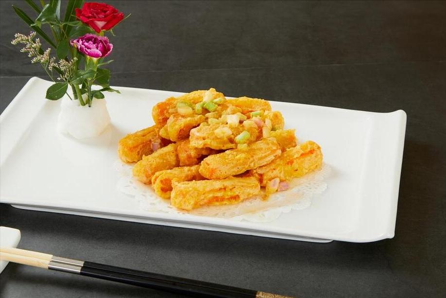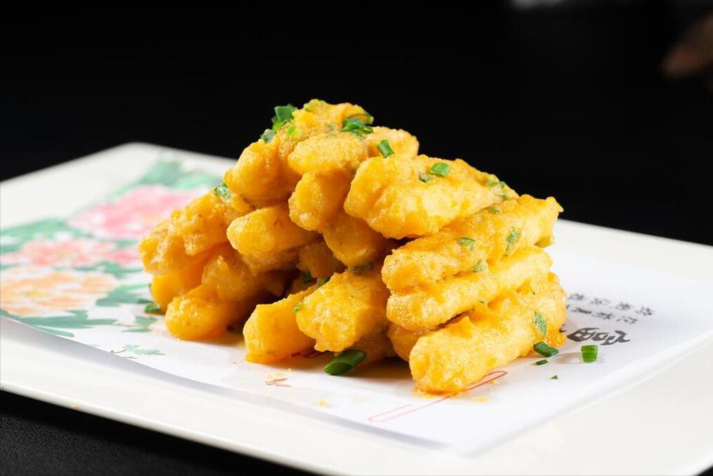3、隨後把鍋內的油倒出來,只留下一點點就行,然後往裏面倒入壓碎的鹹蛋黃開始翻炒,翻炒一陣子之後,就會出現很多泡沫,這個時候將南瓜條倒進去,快速翻炒一會兒,炒到表面裹上鹹蛋黃了,撒上蔥花出鍋。